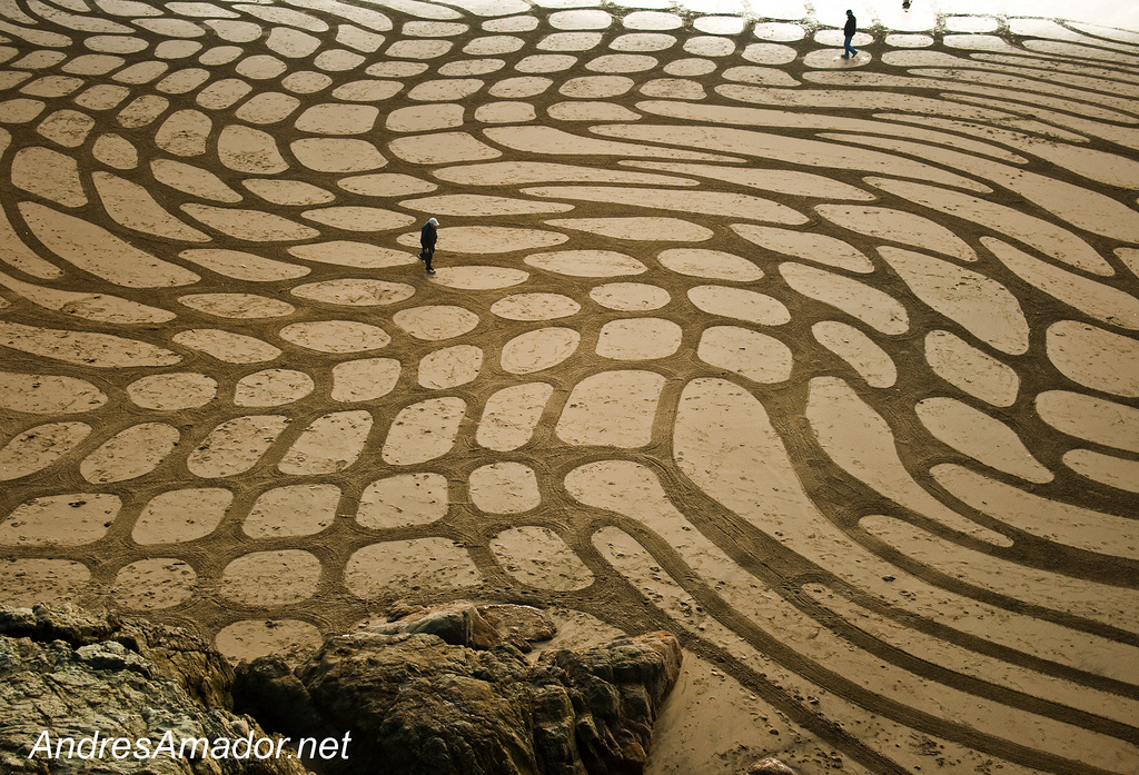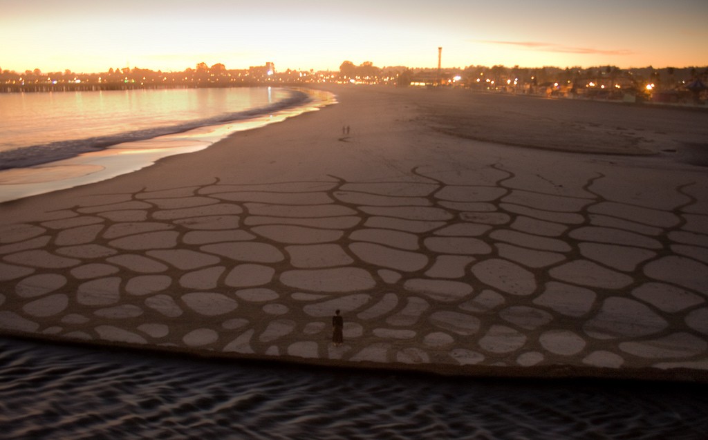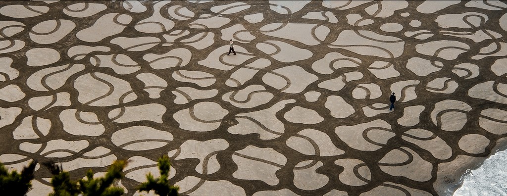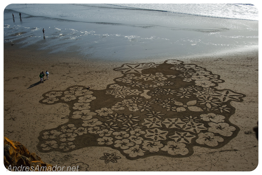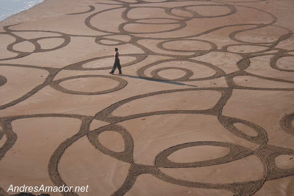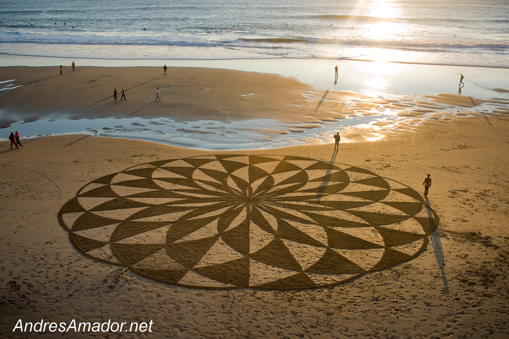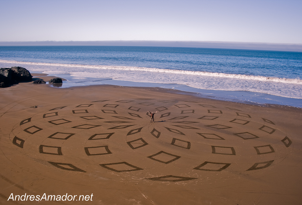 Paysagiste dans la région de San Francisco, voici les dessins sur le sable (ou Sand Paintings) d’Andres Amador. Son outil, un râteau et quelques aides afin d’élaborer les formes géomatriques. Même si ces oeuvres ont une durée de vie très limitée, cette durée est suffisante pour immortaliser son travail à l’aide d’un appareil photo. Son terrain favori, ce sont les immenses plages auxquelles il attribue un côté plus zen. Mais c’est au travers de la lumière des pleines lunes que les toiles de l’artiste dévoilent le plus de leur charme.