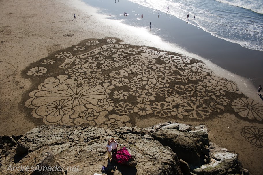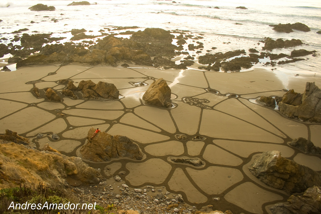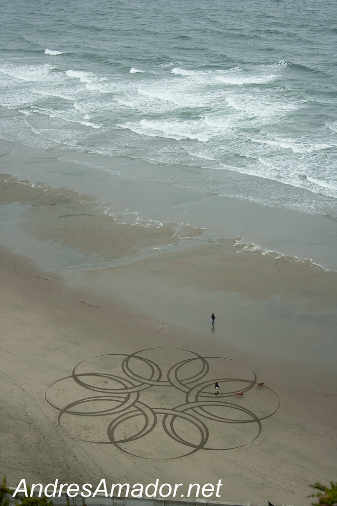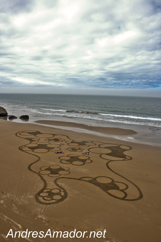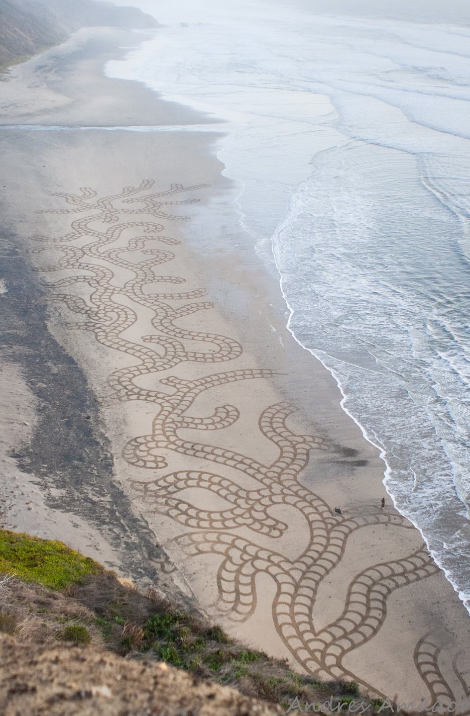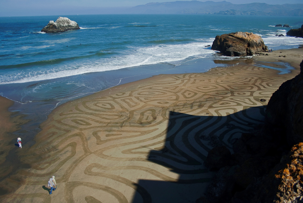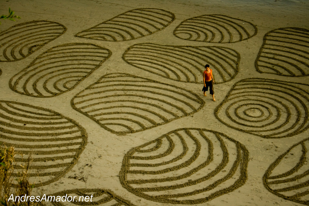 Paysagiste dans la région de San Francisco, voici les dessins sur le sable (ou Sand Paintings) d’Andres Amador. Son outil, un râteau et quelques aides afin d’élaborer les formes géomatriques. Même si ces oeuvres ont une durée de vie très limitée, cette durée est suffisante pour immortaliser son travail à l’aide d’un appareil photo. Son terrain favori, ce sont les immenses plages auxquelles il attribue un côté plus zen. Mais c’est au travers de la lumière des pleines lunes que les toiles de l’artiste dévoilent le plus de leur charme.
