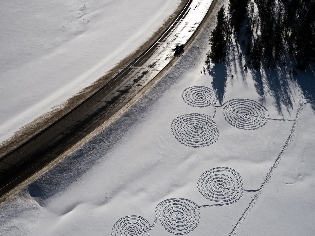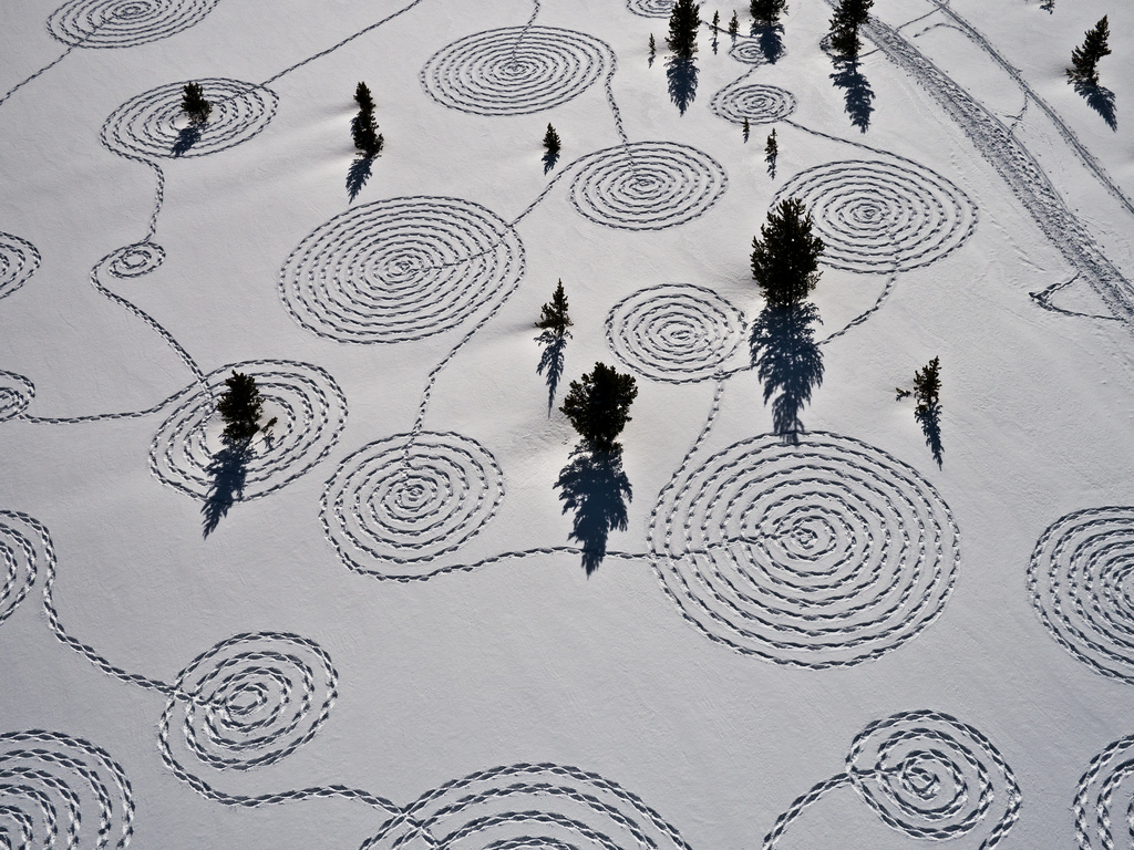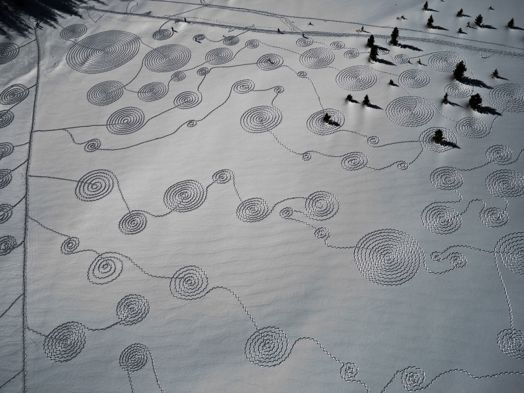 La matière à travailler et les méthodes utilisées sont certes complètement différentes, mais les oeuvres de Sonja Hinrichsen ne seraient pas sans rappeller les Sand Paintings d’Andres Amador. La neige se travaille d’une autre manière que le sable. Ensuite, l’artiste s’est vue aider par cinq volontaires afin d’y mettre leurs empreintes de bottes dans cette matière si fragile et éphémère.