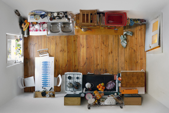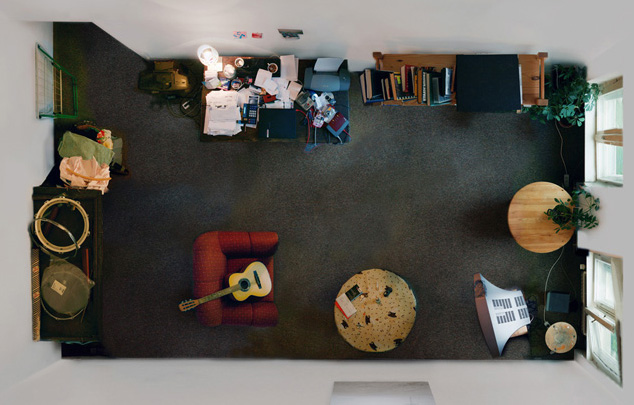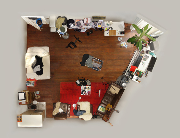Série originale intitulée « Room Portraits » réalisée par l’artiste Menno Aden, établi à Berlin. Cette série de clichés montre l’intérieur d’un point de vue inhabituel, du dessus. Le but est d’exposer les espaces dans des compositions symétriques, ce qui donne une impression d’assemblage dépourvu de bon sens. A cela, on pourrait voir une notion de surveillance et d’un certain aspect de voyeurisme joué volontairement par l’artiste allemand.
