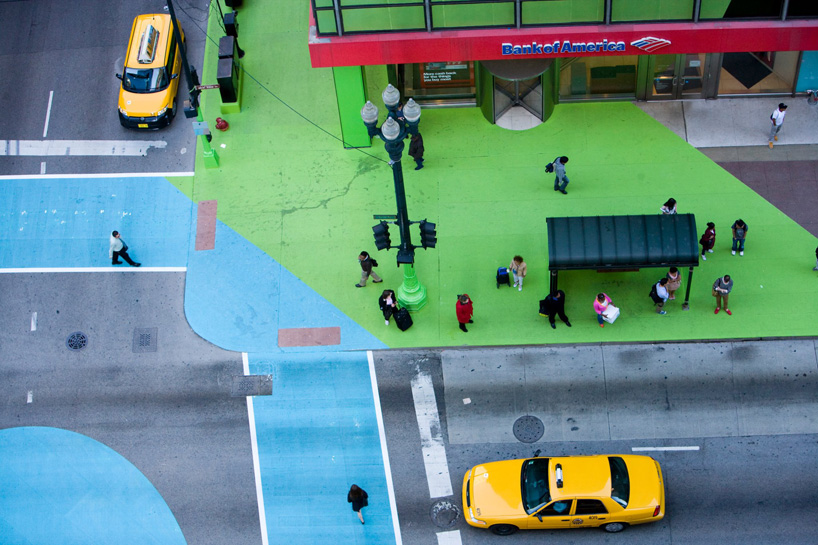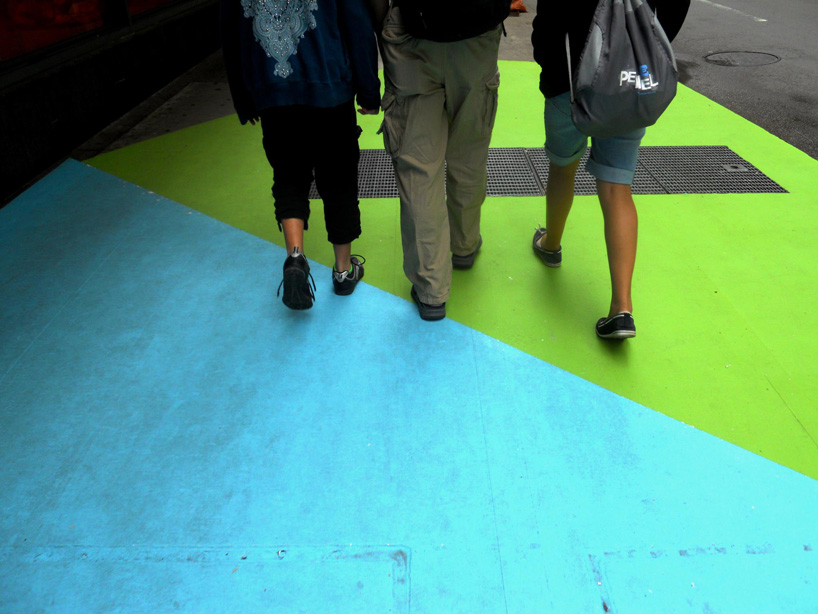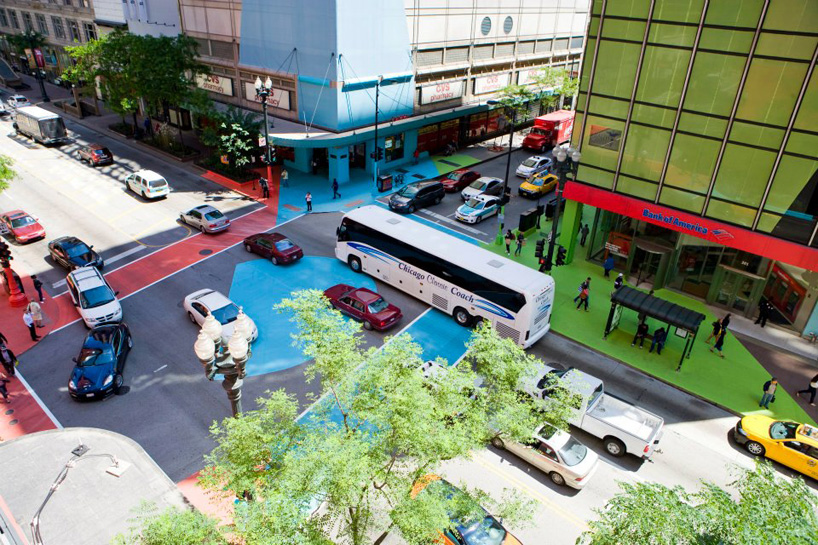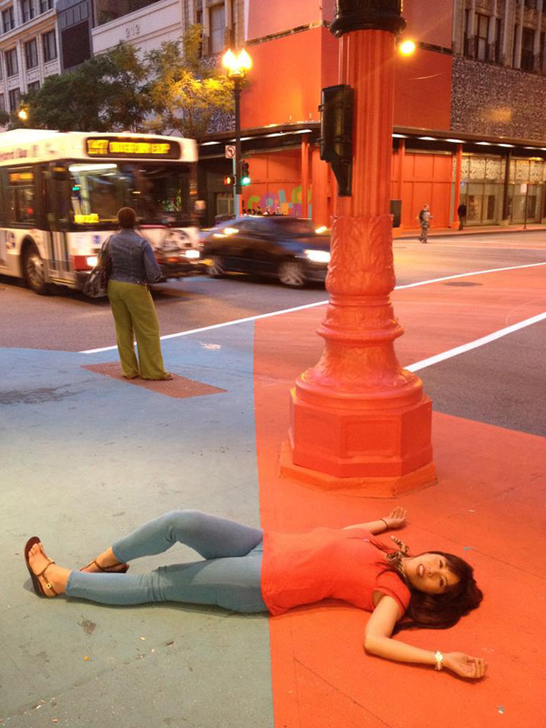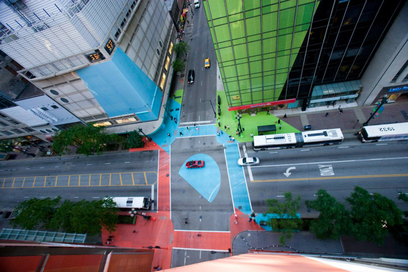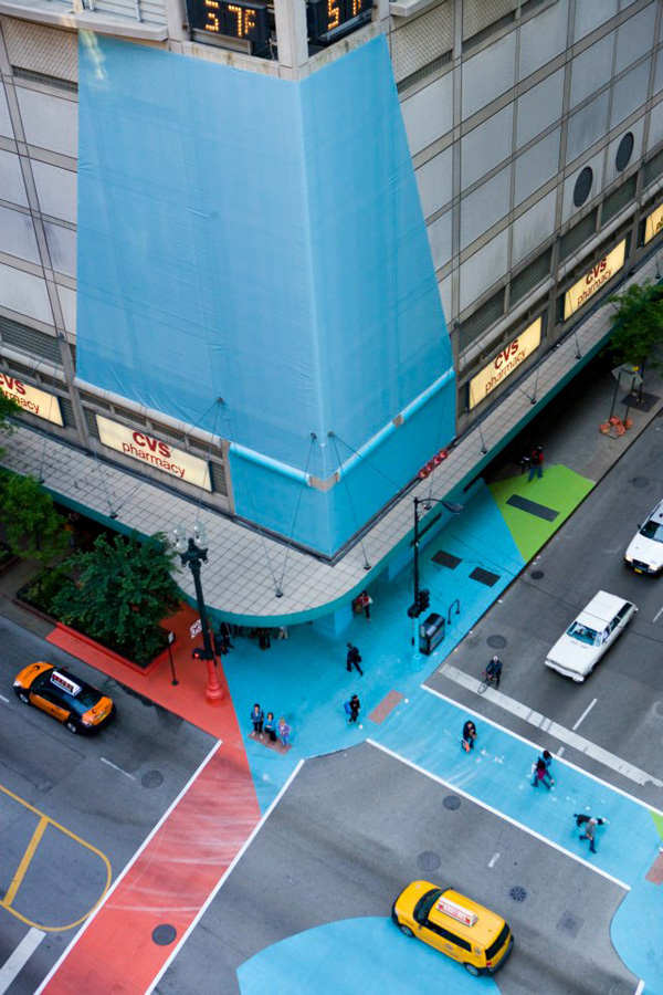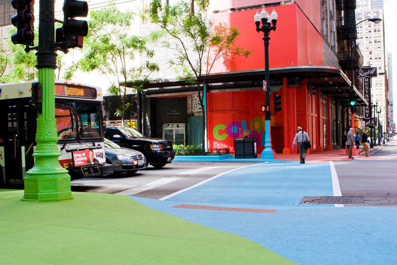 Depuis quelques jours à Chicago, l’intersection a revêtu sa robe d’été faite de vert, bleu et rouge. Ce projet réalisé par l’artiste Jessica Stockholder a été baptisée « Color Jam » et s’avère être une véritable peinture 3D joyeuse et lumineuse au coeur même de l’intersection. Initié par Chicago Loop Alliance, cette nouvelle robe restera visible aux intersections de East Adams Street et South State Street jusqu’à mi-septembre.