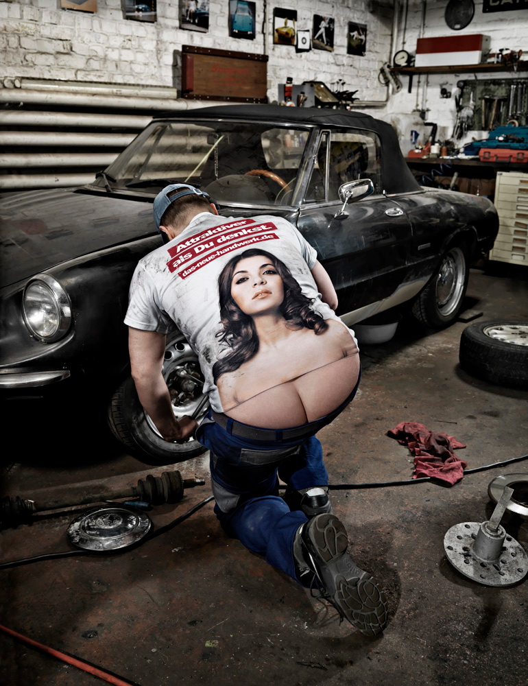Campagne publicitaire intéressante réalisée par Markus Mueller pour les artisans allemands. Sur les photographies, on peut voir le slogan « Attraktiver als Du denkst / Plus attrayant que vous ne le pensez » sur des t-shirts portés par des garagistes ou plombiers. Ces mêmes t-shirts comportent le buste d’une jolie femme juste au-dessus de la lune de ces chers artisans. Une campagne bien pensée, reste à voir si elle promouvra ces métiers difficiles auprès de la clientèle mais aussi auprès des jeunes pour éviter la pénurie.