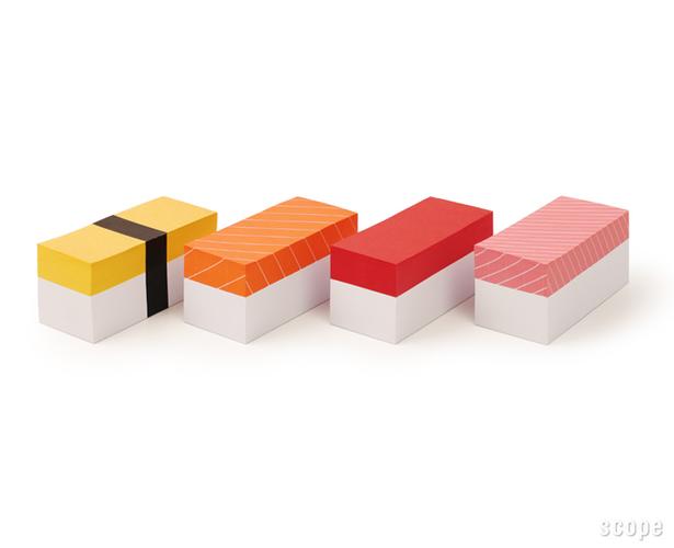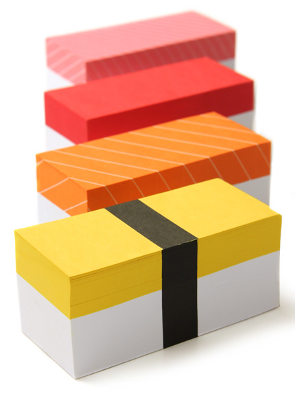 Ces blocs notes en forme de sushis réalisés par Ari Awan, un hindoux installé à Tokyo, devraient ravir les fans inconditionnels de sushis. Il faut compter un peu plus de 15€ pour les acquérir et ce sans compter les frais de ports. De quoi se mettre en appétit. Une idée très simple et originale pour partager des notes entre amis ou tout simplement garder l’important en tête.