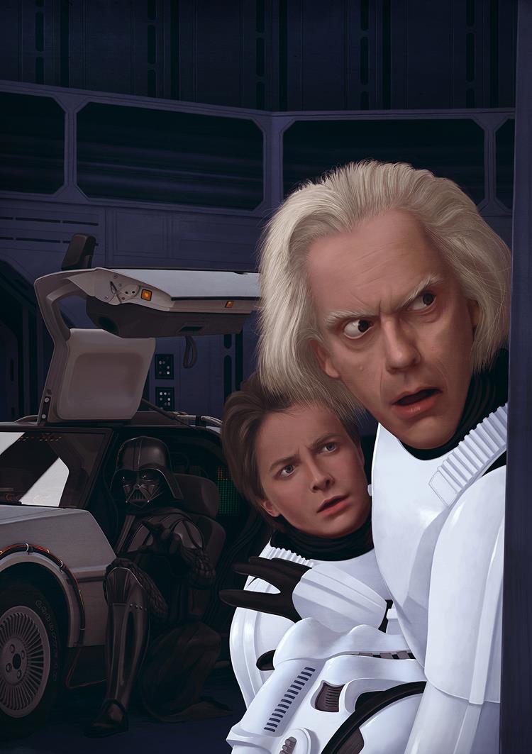 Il y a quelques temps, on m’avait fait découvrir une superbe illustration d’Anton Marrast « Fear and Loathing on Tatooine ». Un mashup qui montrait des personnages de Star Wars dans l’univers du film Las Vegas Parano. Cette fois, le génial russe sort un autre Mashup et cette fois, son illustration baptisée « I Find Your Lack Of Jiggawatts Disturbing » montre Doc et Marty entrain de regarder ce qu’il se passe au coin d’un mur, alors que Darth Vader s’empare de la DeLoeran.