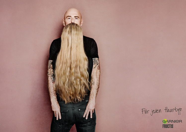 Campagne publicitaire réalisée de manière ingénieuse pour le compte de la marque Fructis de Garnier. Afin de montrer que les produits sont destinés aussi bien à la gente féminine que masculine. L’idée originale est de photographier un homme de face avec une femme de dos, la tête à la hauteur du nez, leur chevelure faisant alors office de barbe. Un concept ingénieux réalisé par Publicis Switzerland en collaboration avec les photographes de Billy & Hells.