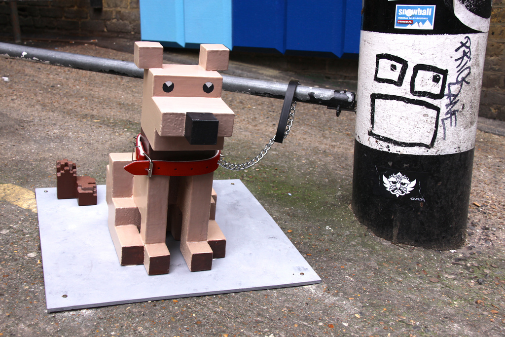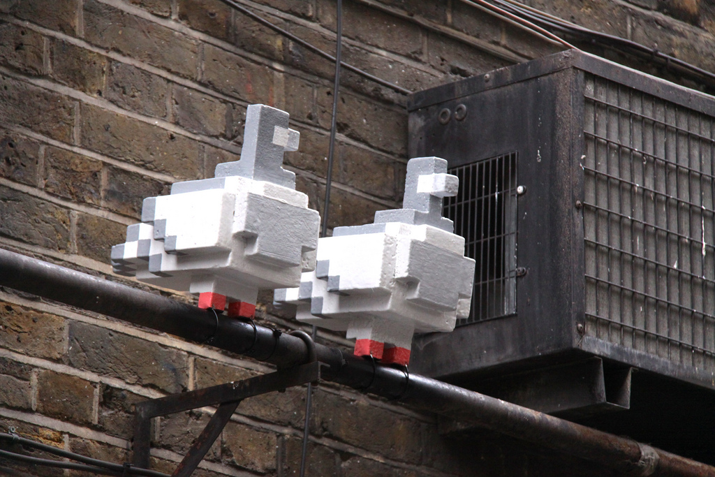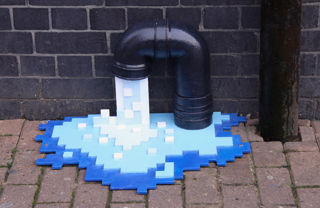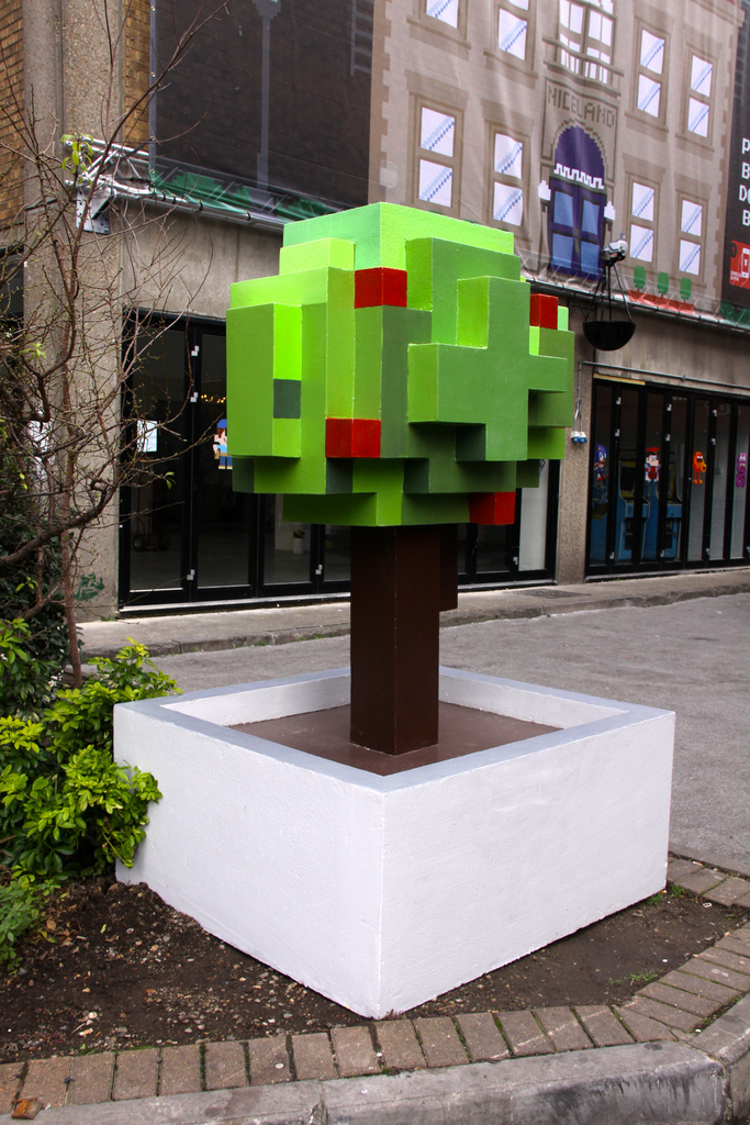 A la sortie du dernier Disney « WRECK IT RALPH », les studios Aden Hynes Sculpture ont transformé l’avenue Brick en pleins coeur de Londres. Une avenue qui arbore tout un tas d’objets et animaux en 8 bits, en passant par les nuages, de l’eau, des voitures, des chiens, des pigeons, des arbres et jusqu’à même des déjections canines. Rien n’a été laissé au hasard puisqu’on peut également voir des jeux d’arcades Fix It Felix Jr. ou des autocollants qui rappellent une autre époque apposés sur les vitrines des magasins qui parsèment l’avenue.