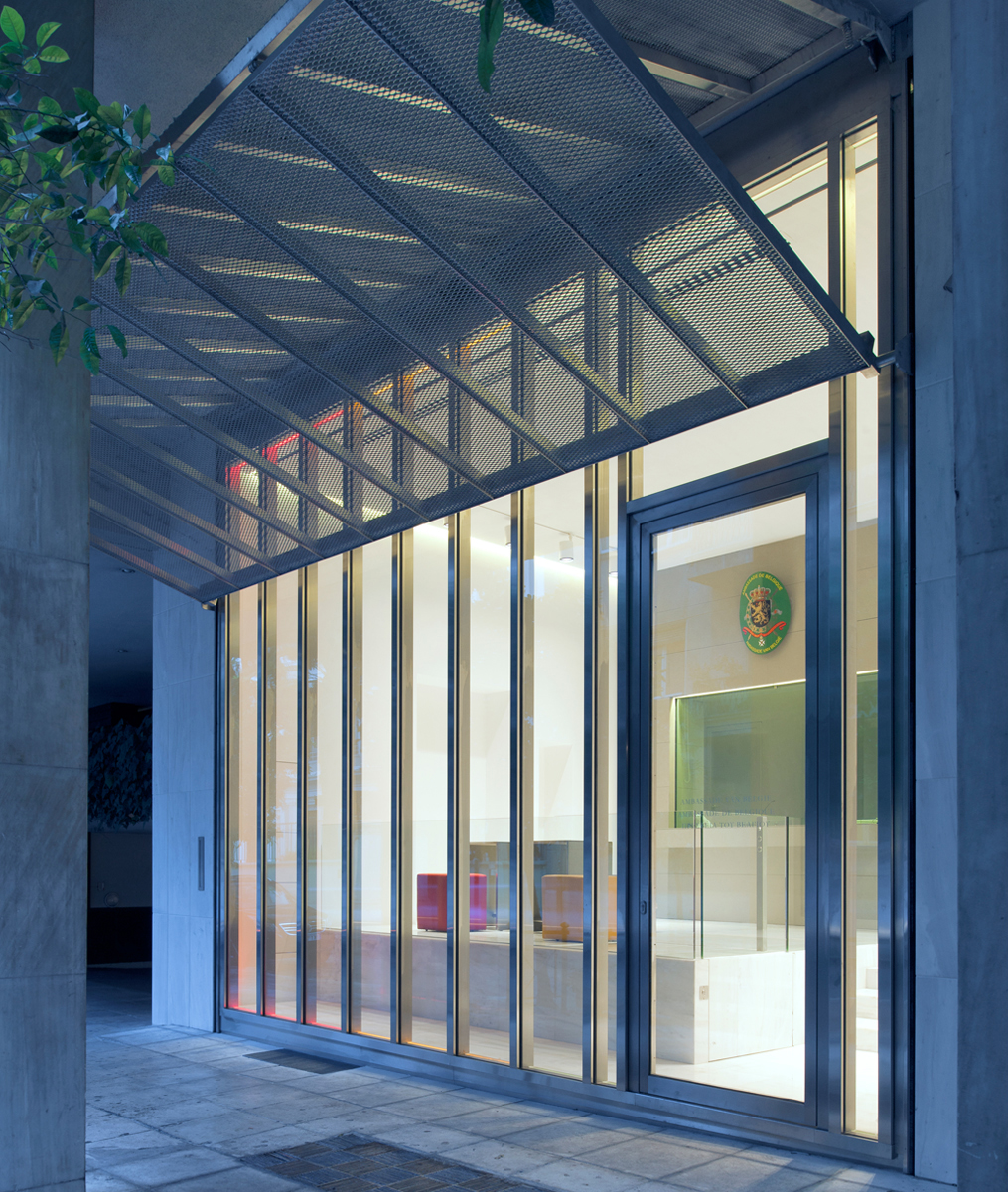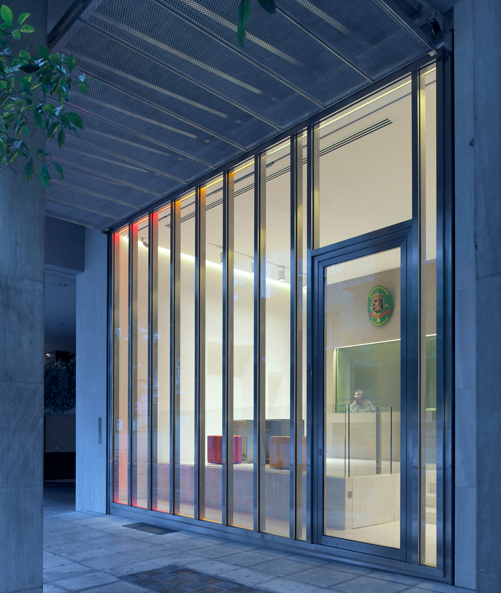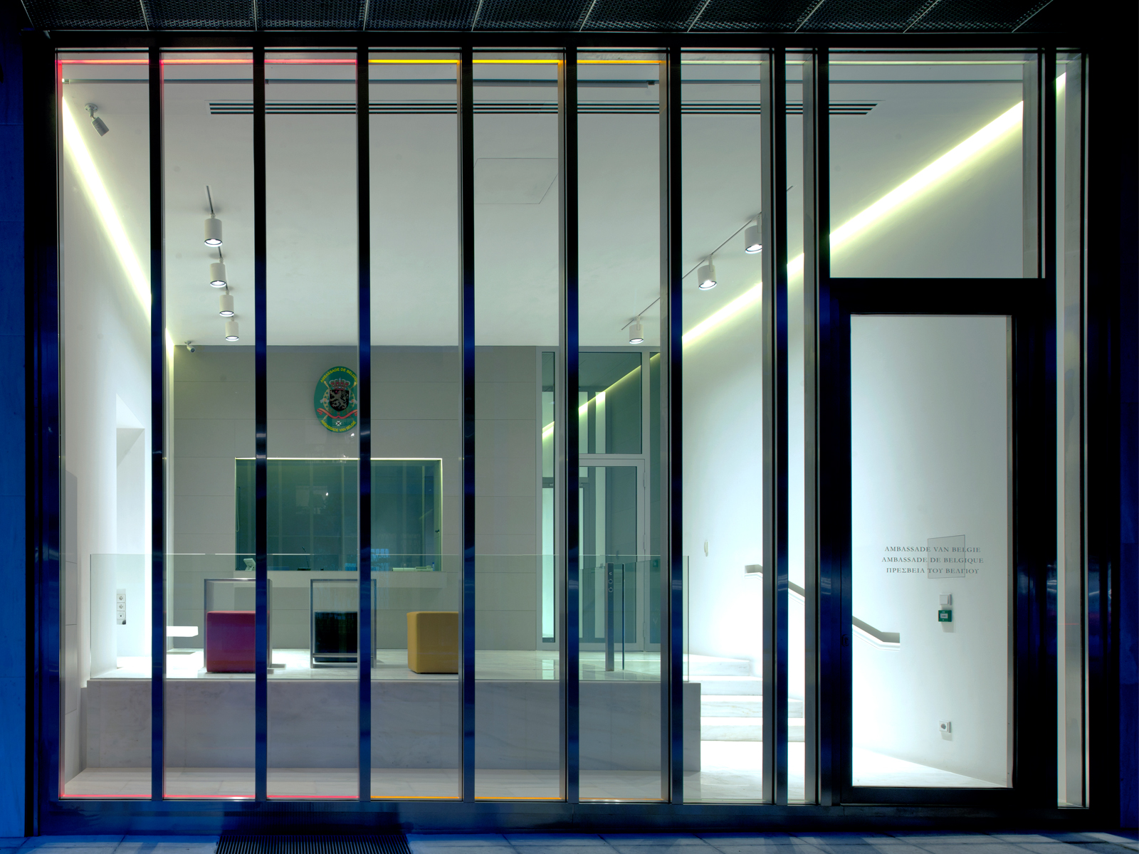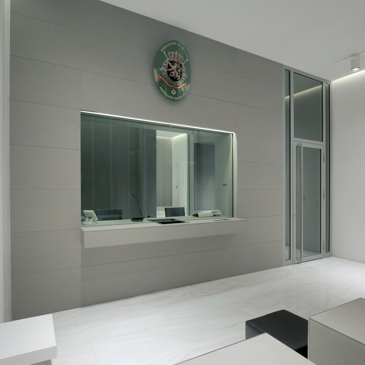 Récemment, l’Ambassade de Belgique établie à Athènes a eu droit à un liefting. Établie au coeur de la capitale grecque, ce bâtiment prestigieux date de la fin des années 60 et est composé de trois étage. Le travail qui a été effectué sur ce bâtiment concerne à la fois la devanture de l’ambassade mais aussi un réaménagement intérieur. Une nouvelle façade, transparente et interactive, en proposant un éclairage qui représente le drapeau du Royaume de Belgique. Cette façade se veut aussi bien protectrice, en offrant des vitres épaisses et une armature qui se déplie ou replie en fonction des besoins. L’accueil qui fait également office de salle d’attente est quant à lui très spacieux et minimaliste. L’acier et le verre sont omniprésents dans ces différents espaces, afin d’offrir une sensation de robustesse et de sécurité.