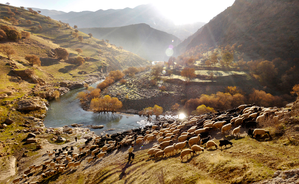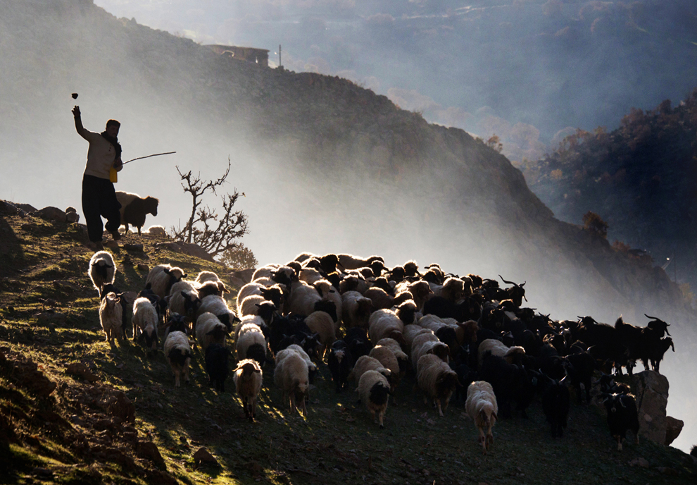 En Iran, près de la frontière Irakienne, un berger mène son troupeau de moutons