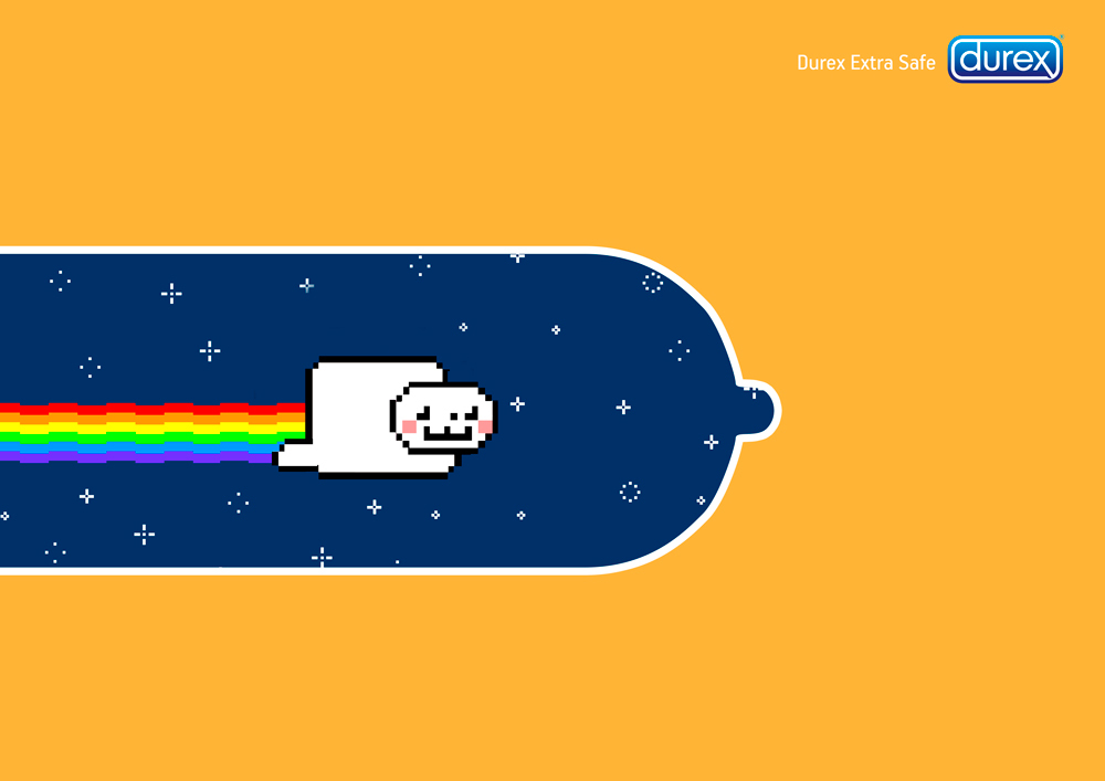 « Durex Extra Save » est un projet de l’artiste russe Polina Bogdanov. L’idée de l’illustratrice est de reprendre des phénomènes de mode pour les intégrer dans une publicité liée aux préservatifs de la marque Durex. C’est ainsi qu’on y retrouve les Angry Birds ou le Nyancat dans une image qui leur convient naturellement.