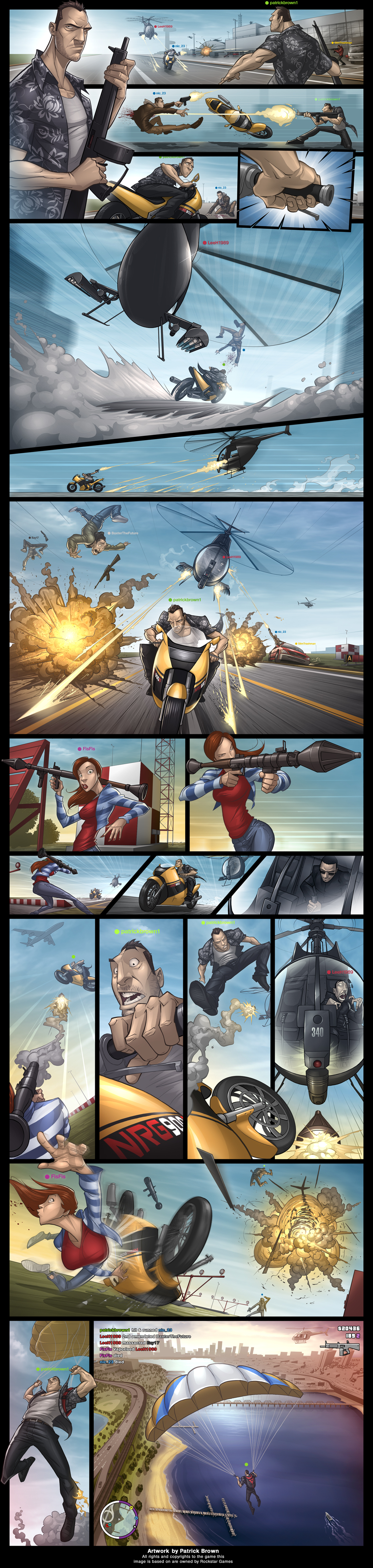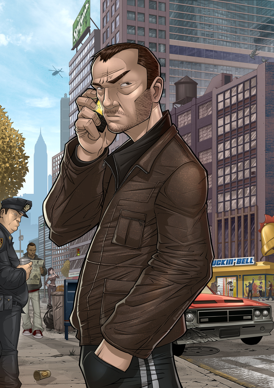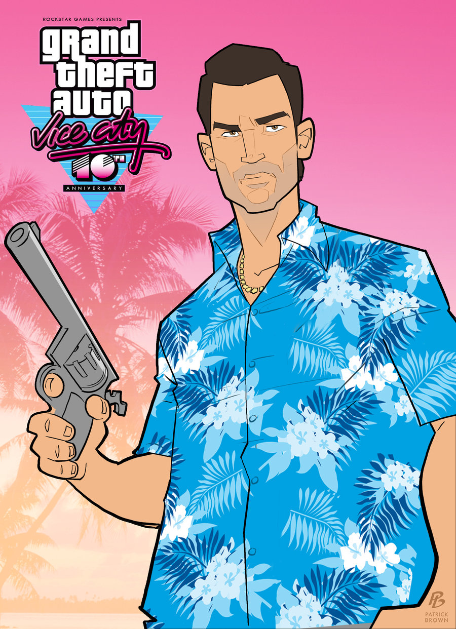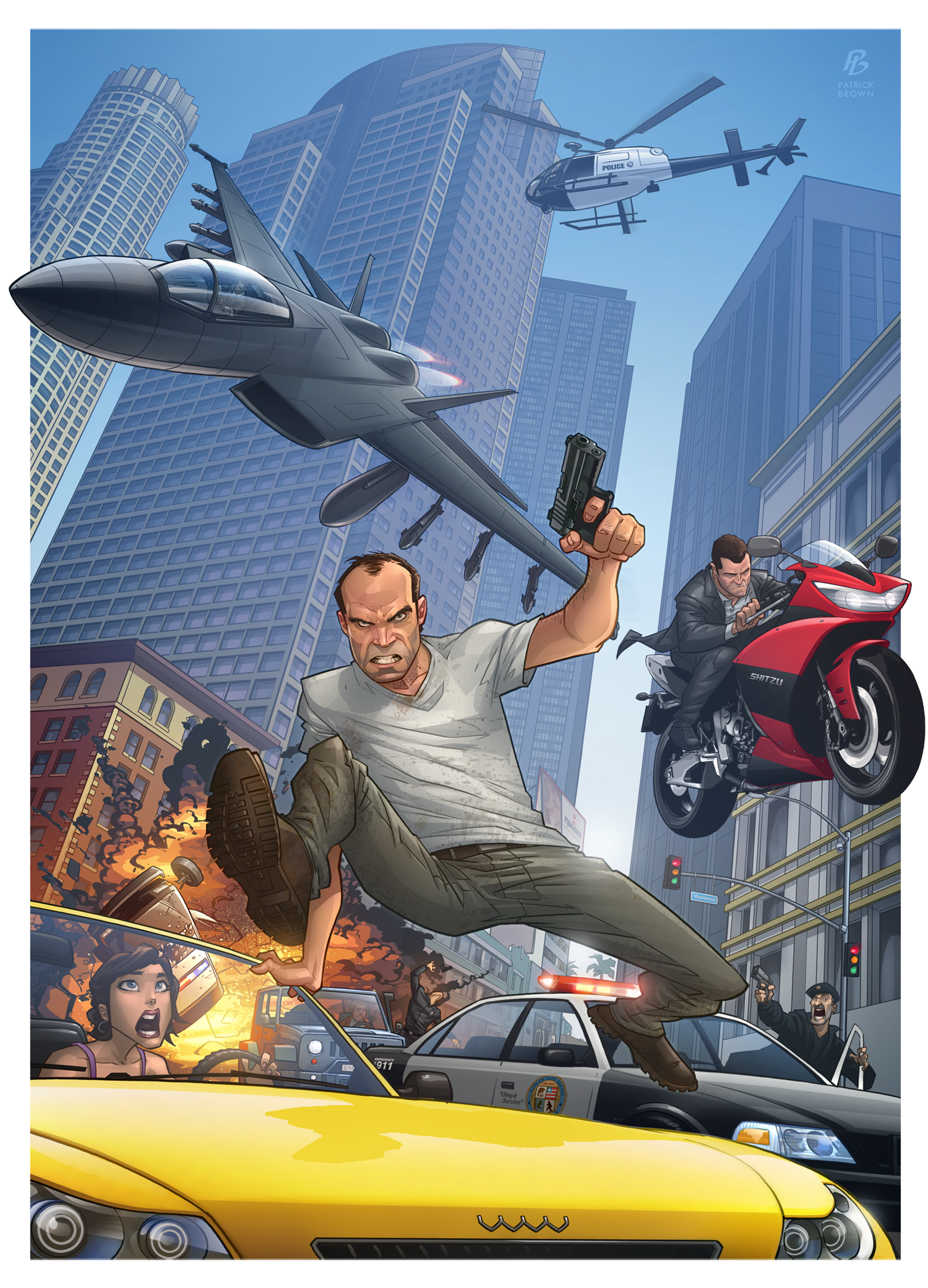 Patrick Brown (dont j’avais parlé dans un précédent article) réapparaît sur le zine avec la sortie récente du jeu Grand Theft Auto. Cet illustrateur, inconditionnel de la franchise GTA, a réalisé beaucoup d’illustrations ces derniers temps liées à l’univers déjà riche du jeu. C’est ainsi qu’on découvre ou redécouvre des personnages des différents volets comme Niko Bellic de l’épisode IV, Franklin Clinton, Trevor Philips ou Michael De Santa de l’épisode V ou encore Tommy Vercetti de GTA Vice City et Carl « CJ » Johnson de GTA San Andreas.