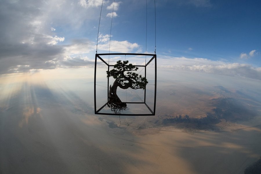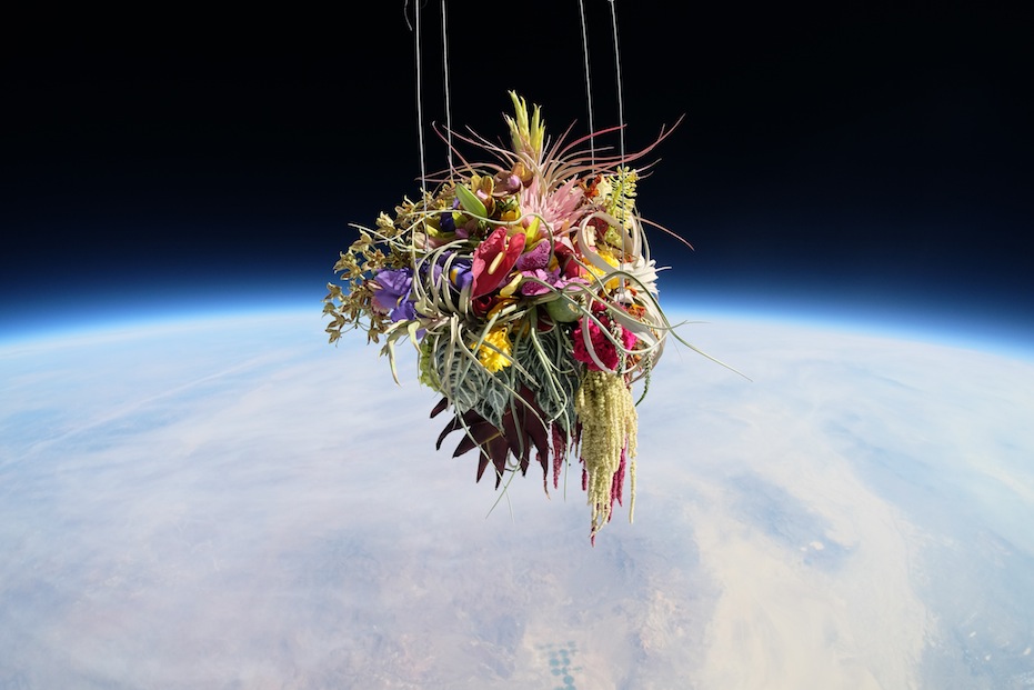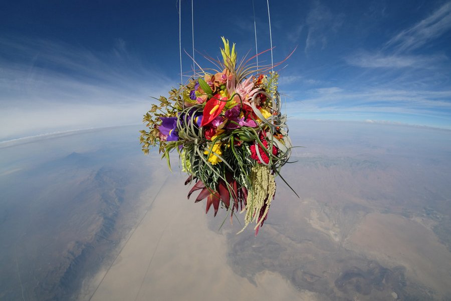 Il y a quelques jours, le botaniste artiste japonais Makoto Azuma a tenté d’aller où la plupart des artistes rêvent de se rendre : l’Espace. Dans son projet baptisé Exbiotanica, Makoto Azuma avec l’aide de John Powell de JP Aerospace et son équipage, sont parti pour le Désert de Black Rock dans le Névada. C’est durant la nuit que le projet de Makoto pris forme. L’équipe chargée du lancement, a lâché deux oeuvres d’Azuma Makoto, un pin de 50 ans et un bouquet arrangé de fleurs rangés précieusement dans une boite en métal. Attachés à de grands ballons gonflés à l’hélium, les ballons sont montés dans la Stratosphères. C’en suit un projet entièrement documenté révélant de superbes clichés surréaliste de plante flottant au-dessus de notre planète Terre.
