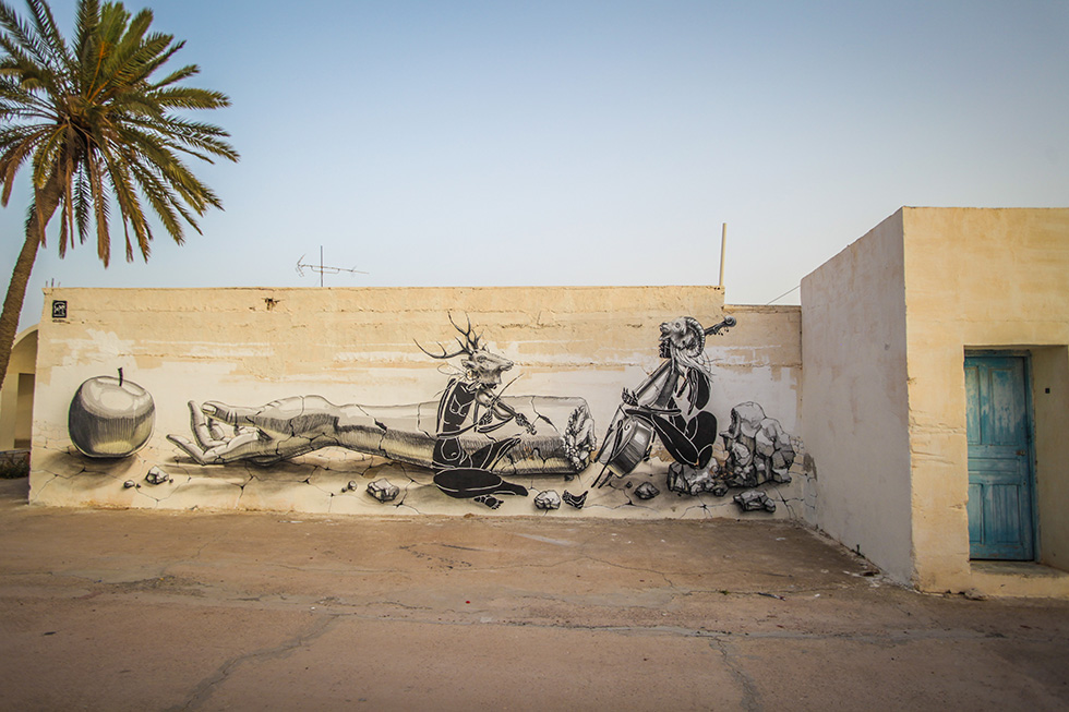 Tout ce fait en Tunisie sur l’île de Djerba dans un village appelé Erriadh. Ce sont 150 street-artists de 30 nationalités différentes qui ont eu l’occasion de coller quelques coups de pinceau, bombes de couleur afin d’y faire fleurir des couleurs. Un véritable musée à ciel ouvert pour cette galerie dédiée à l’art de rue alimenté durant tout cet été.