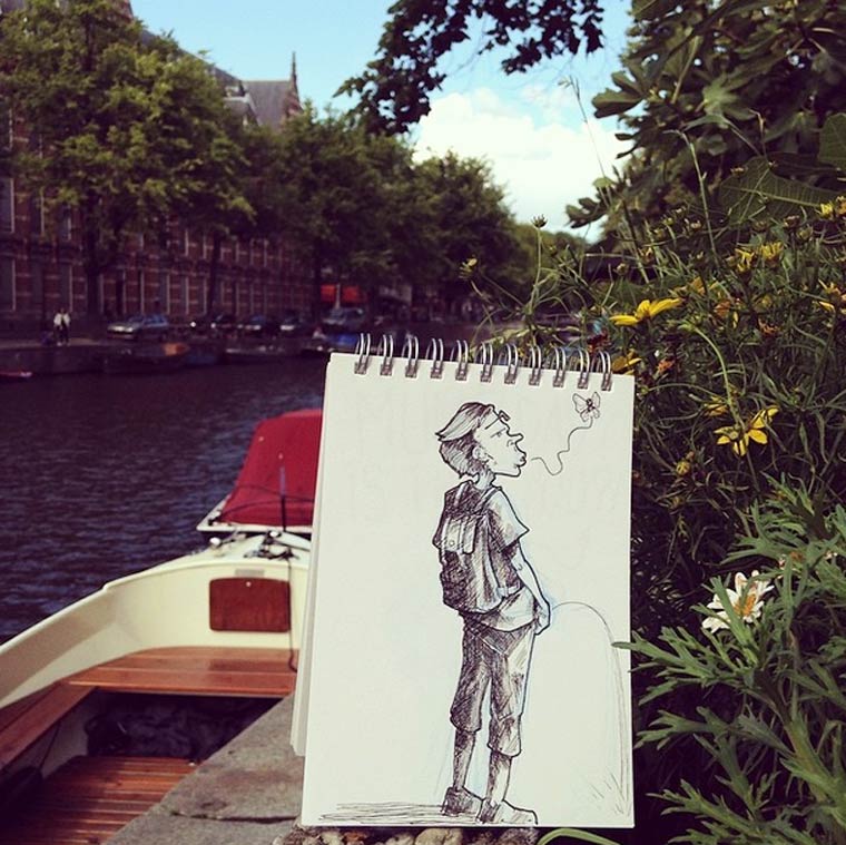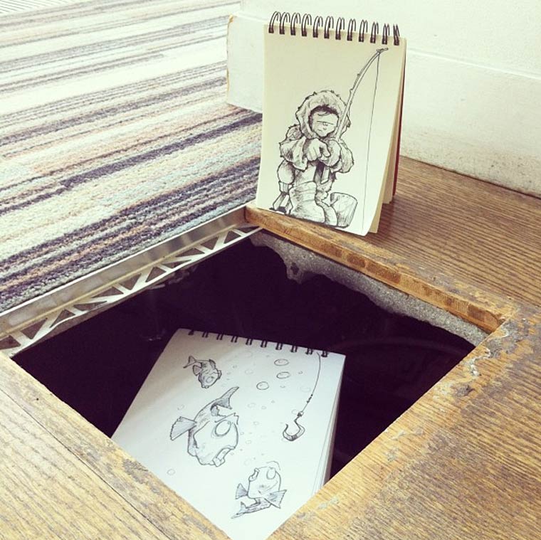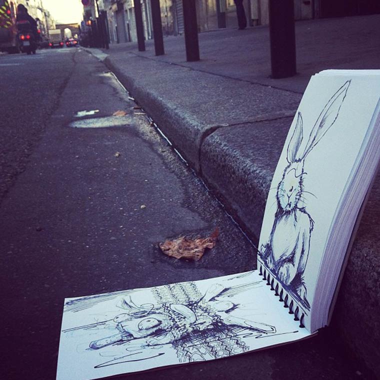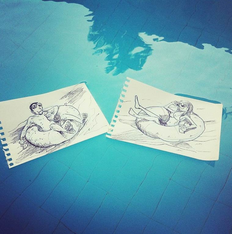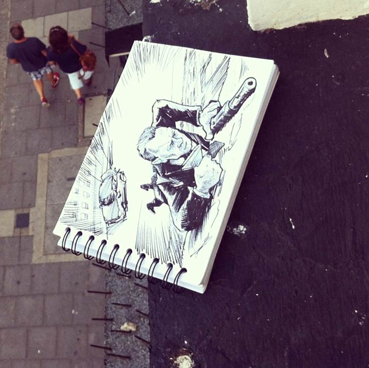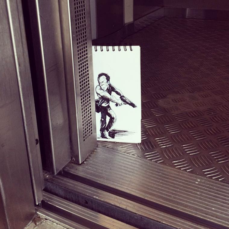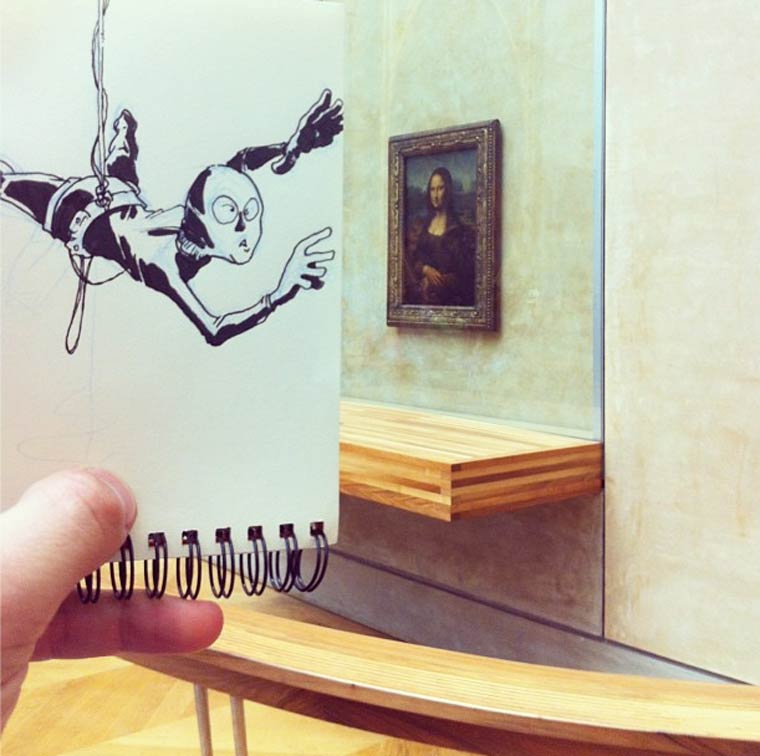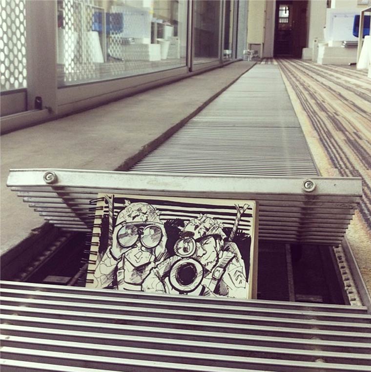 Voilà une idée pleine d’humour. L’illustrateur et directeur artistique Troqman crée des dessins qu’il place à certain endroit bien précis. De cette manière, cela lui permet de recréer une scène complètement différente de celle d’origine, mais mieux encore, ces dessins intéragissent avec le milieu dans lequel elles sont placées. Une manière d’amener la scénarisation à un tout autre niveau.