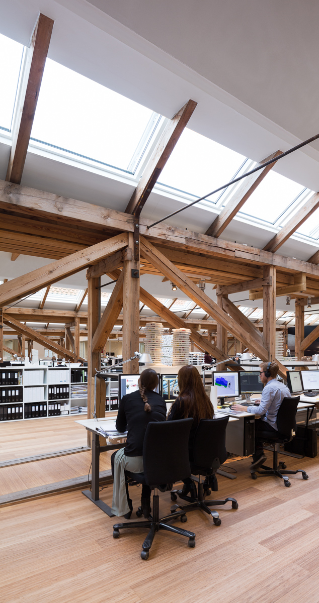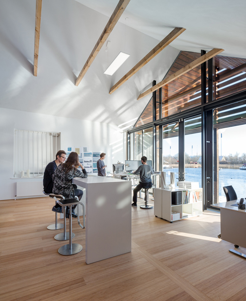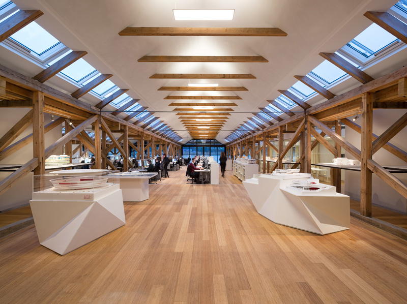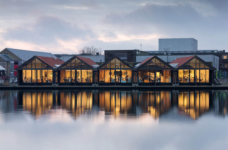 Classés au patrimoine danois, le cabinet d’architecte 3XN a restauré l’extérieur de ces hangars et s’est contenté de modifier de manière conséquente l’intérieur. Le but du fondateur de 3XN était que les équipes soient entièrement mélangées et puissent travailler en collaboration, tout en ayant suffisamment de lumière naturelle le jour. Tout le monde a vue sur tout le personnel de sorte qu’ils se sentent inspirer par les diverses équipes qui composent le cabinet d’architecte.