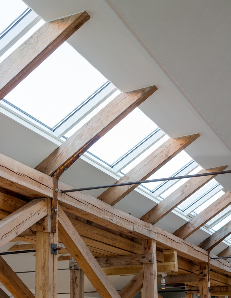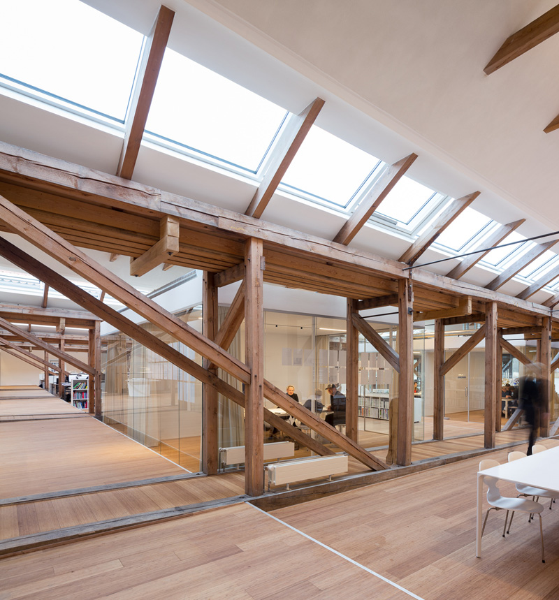 L’intérieur est ouvert, sobre, composés de murs blancs. La structure originale en bois est là pour adoucir l’intérieur. Les salles de réunion quant à elles sont composées de murs de vitres afin de garder cette optique d’ouverture et de lumière.
