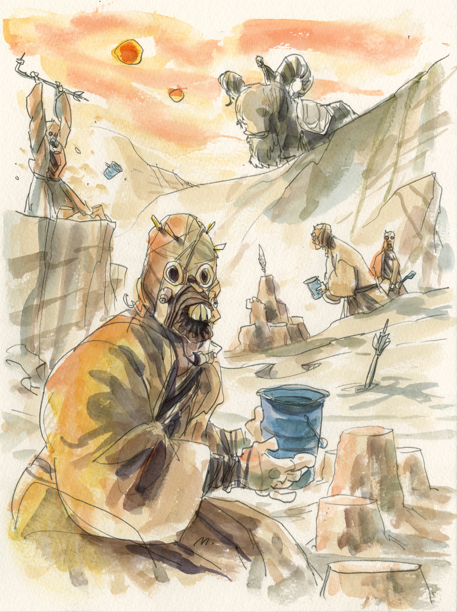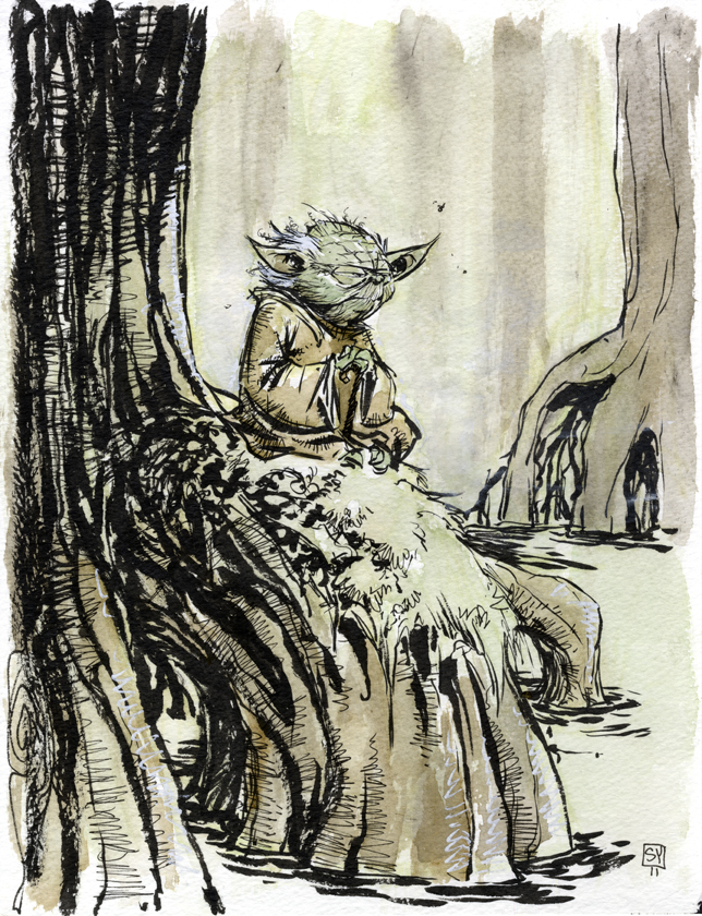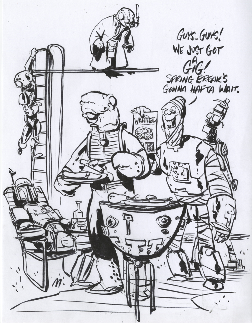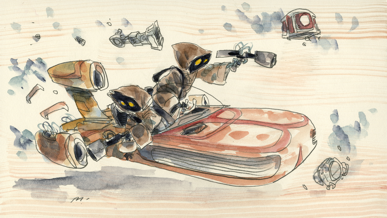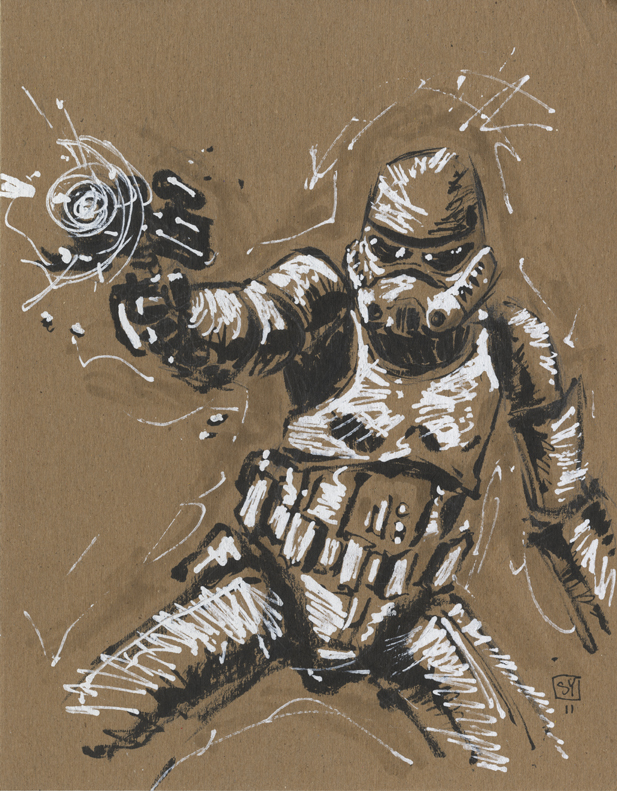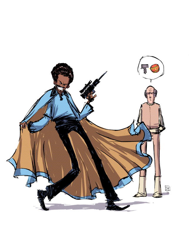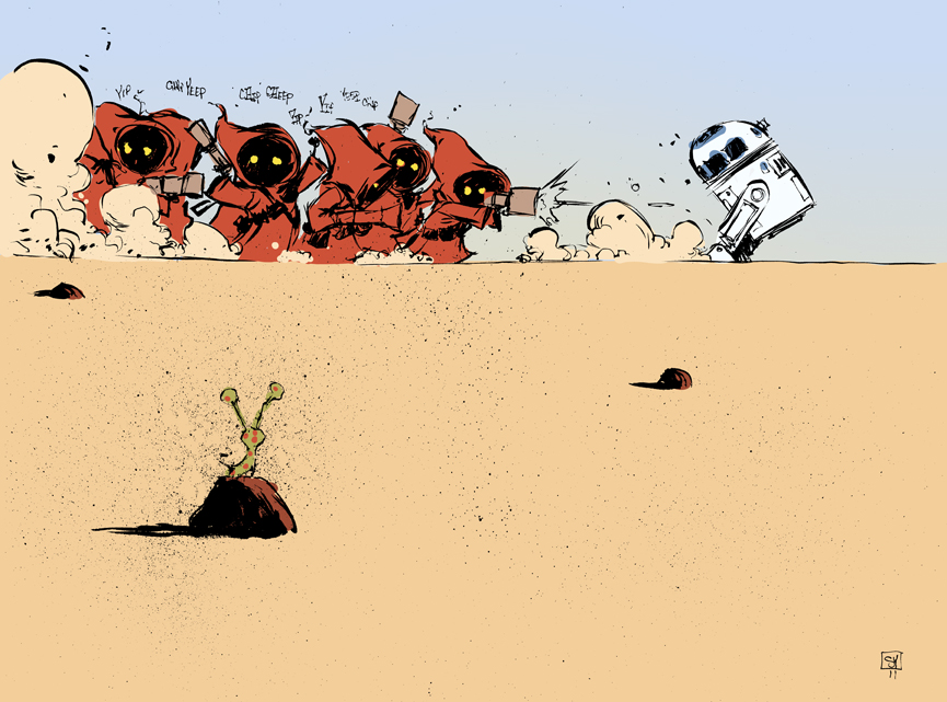 Voici une excellente série de dessins réalisés par les deux acolytes Scott Morse et Skottie Young. Une myriade d’illustrations qui nous montre leur vision de l’univers Star Wars. Des dessins qui sont principalement basés sur la dernière trilogie (épisode IV, V et VI) qui se veulent tantôt sérieux, tantôt humoristique comme ce Darth Vader en version kid qui rappellerait bien la publicité de Volksagen et son Darth Vader junior.