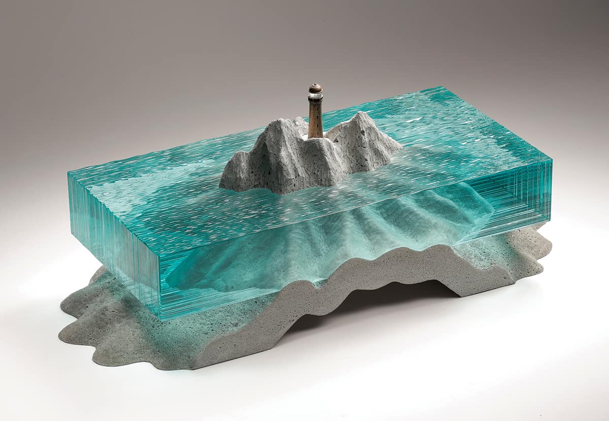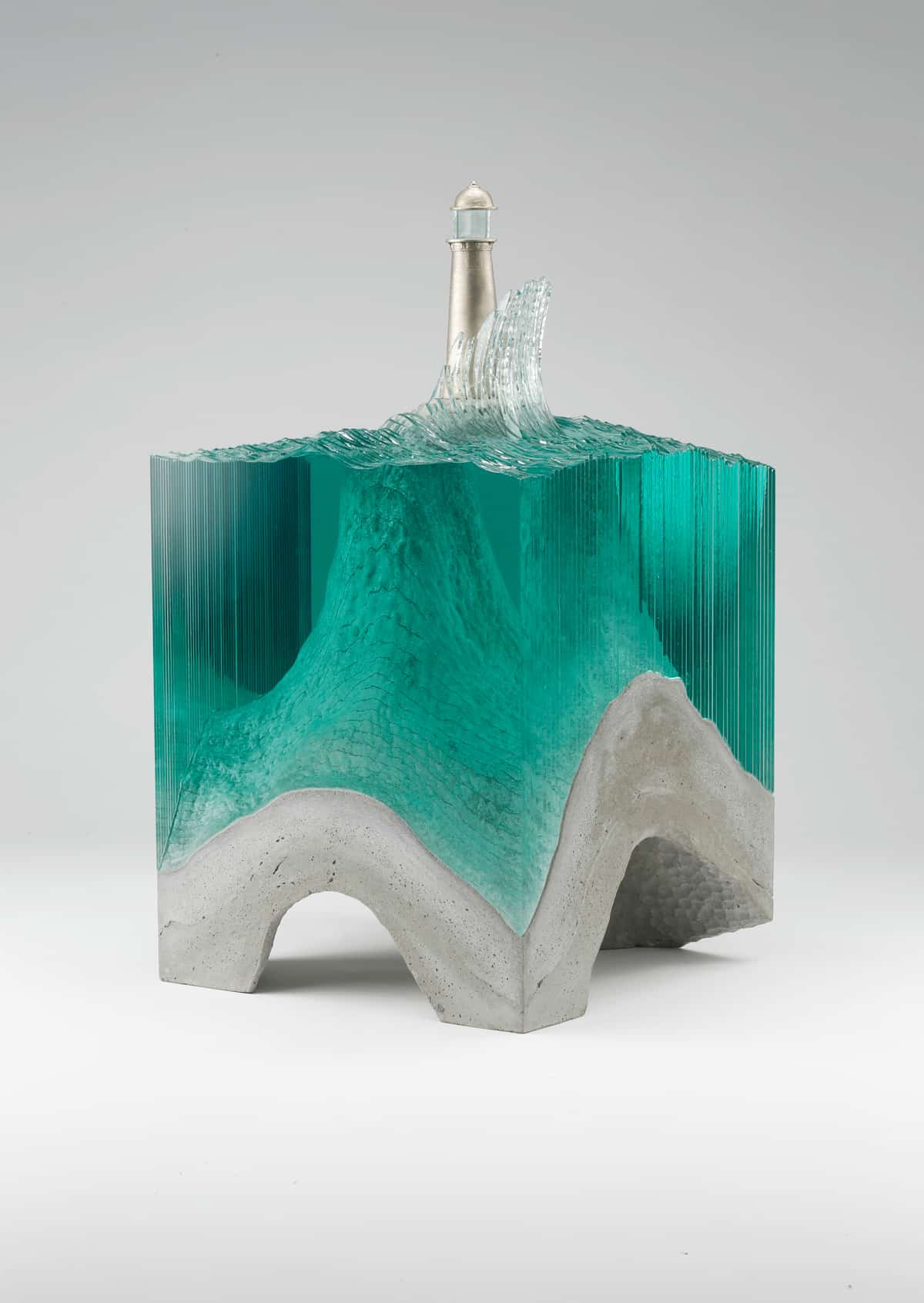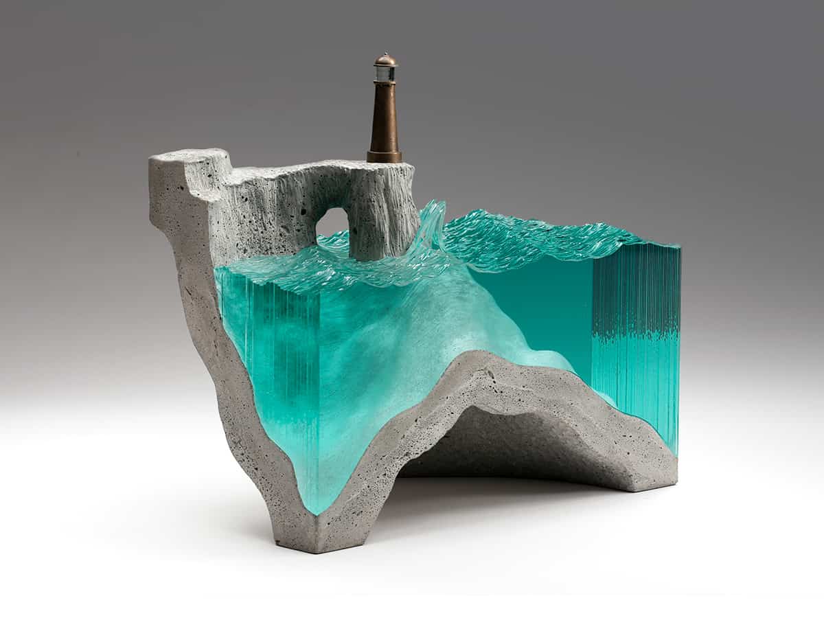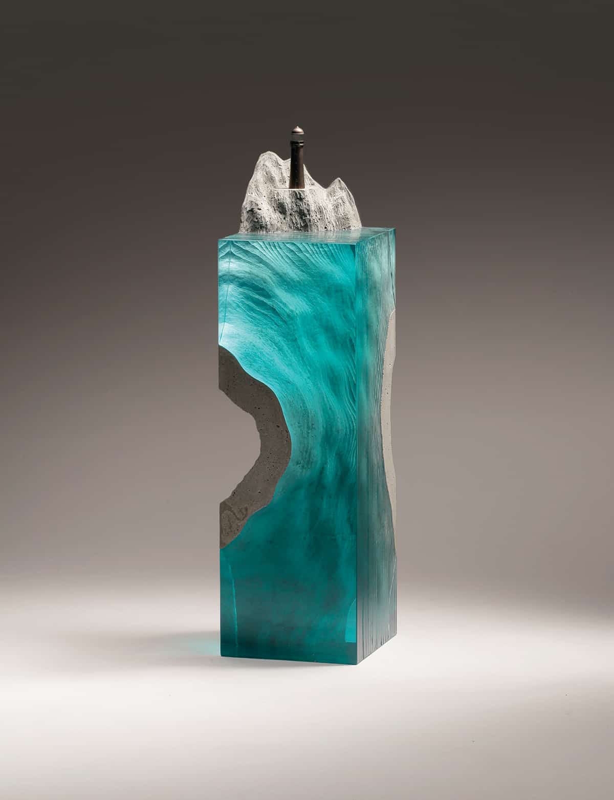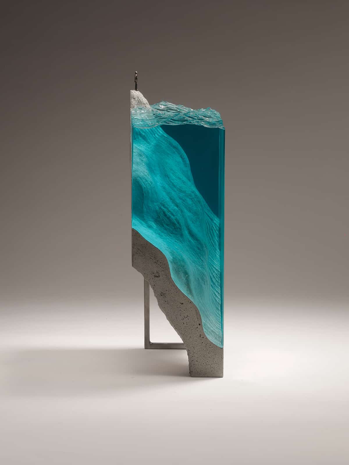 Ben Young utilise des techniques manuelles pour transformer des feuilles de verre en sculpture lumineuses. Des sculptures lumineuses qui donnent un aperçu d’un moment dans le temps ou dans l’espace. L’artiste imagine, coupe à la main et construit soignement ses sculptures à l’aide de couches de verre, souvent pour évoquer l’eau, et des formes organiques en béton pour évoquer la topographie. Il y ajoute alors des détails en métal comme un plongeur, un phare ou encore un voilier.