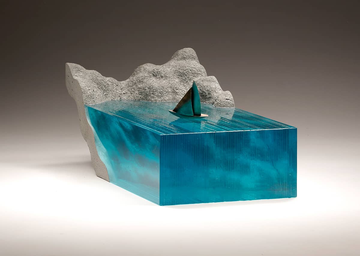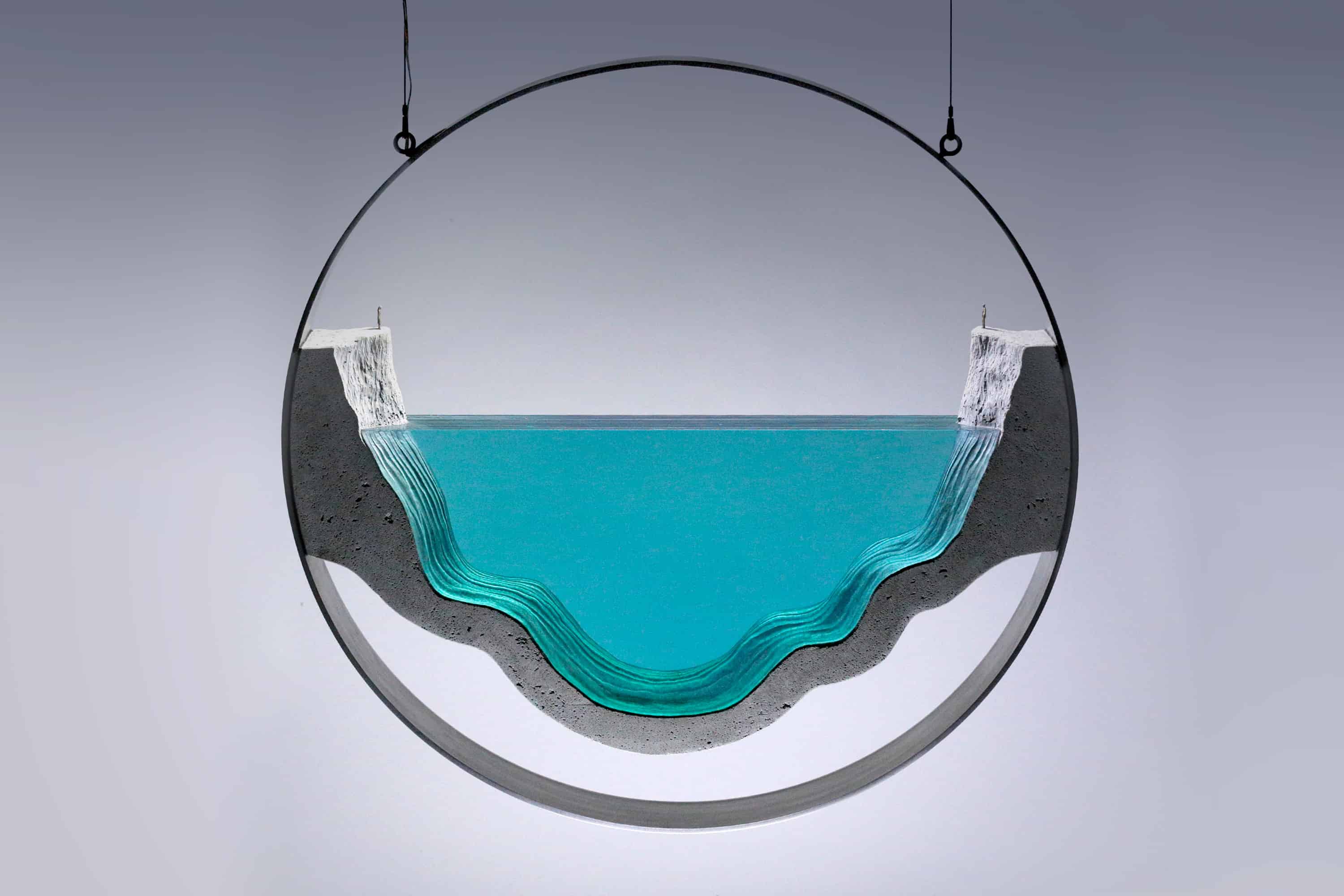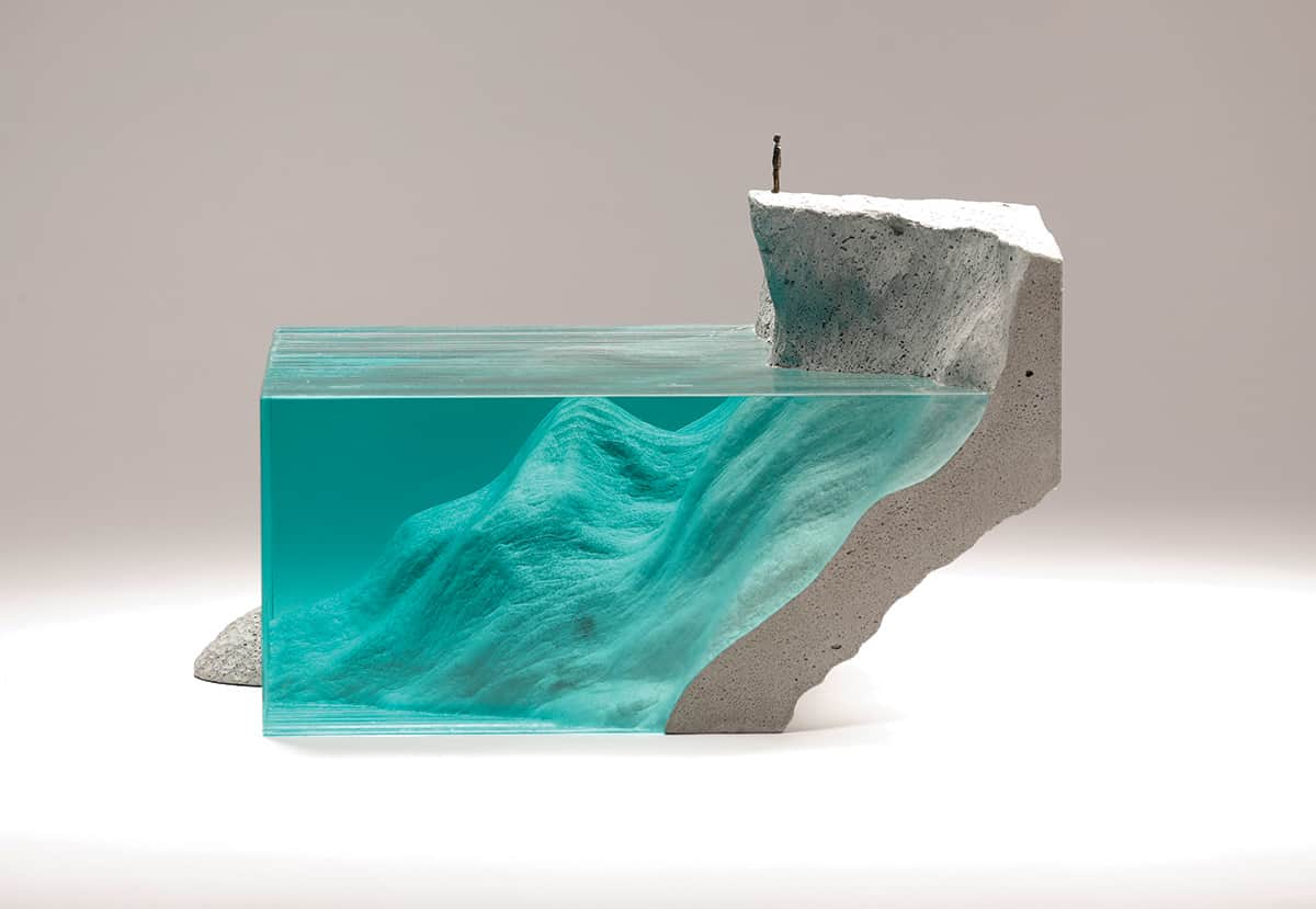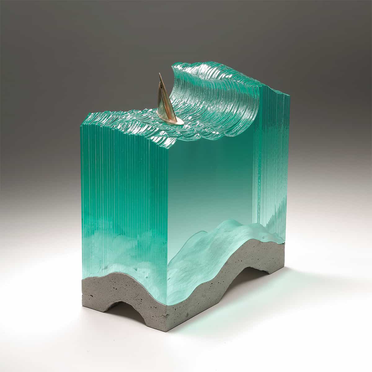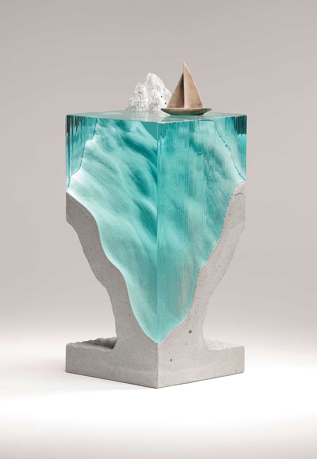 Ben Young utilise des techniques manuelles pour transformer des feuilles de verre en sculpture lumineuses. Des sculptures lumineuses qui donnent un aperçu d’un moment dans le temps ou dans l’espace. L’artiste imagine, coupe à la main et construit soignement ses sculptures à l’aide de couches de verre, souvent pour évoquer l’eau, et des formes organiques en béton pour évoquer la topographie. Il y ajoute alors des détails en métal comme un plongeur, un phare ou encore un voilier.