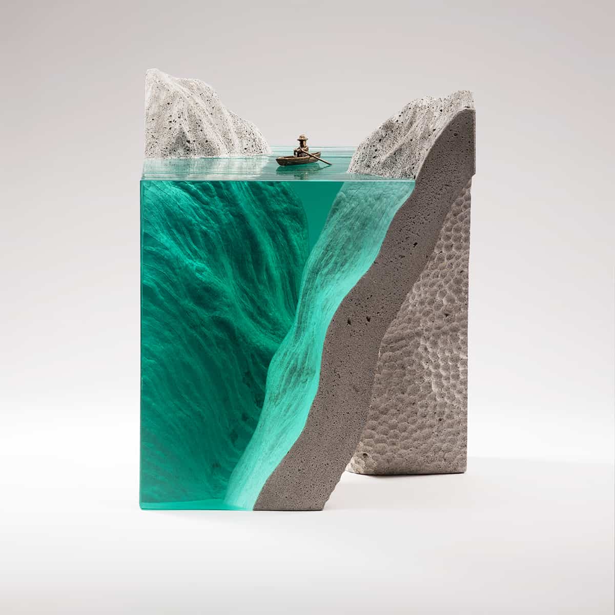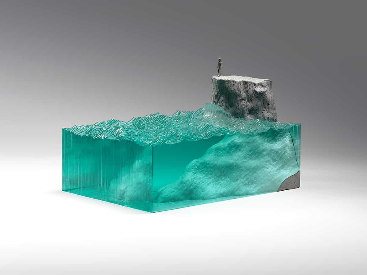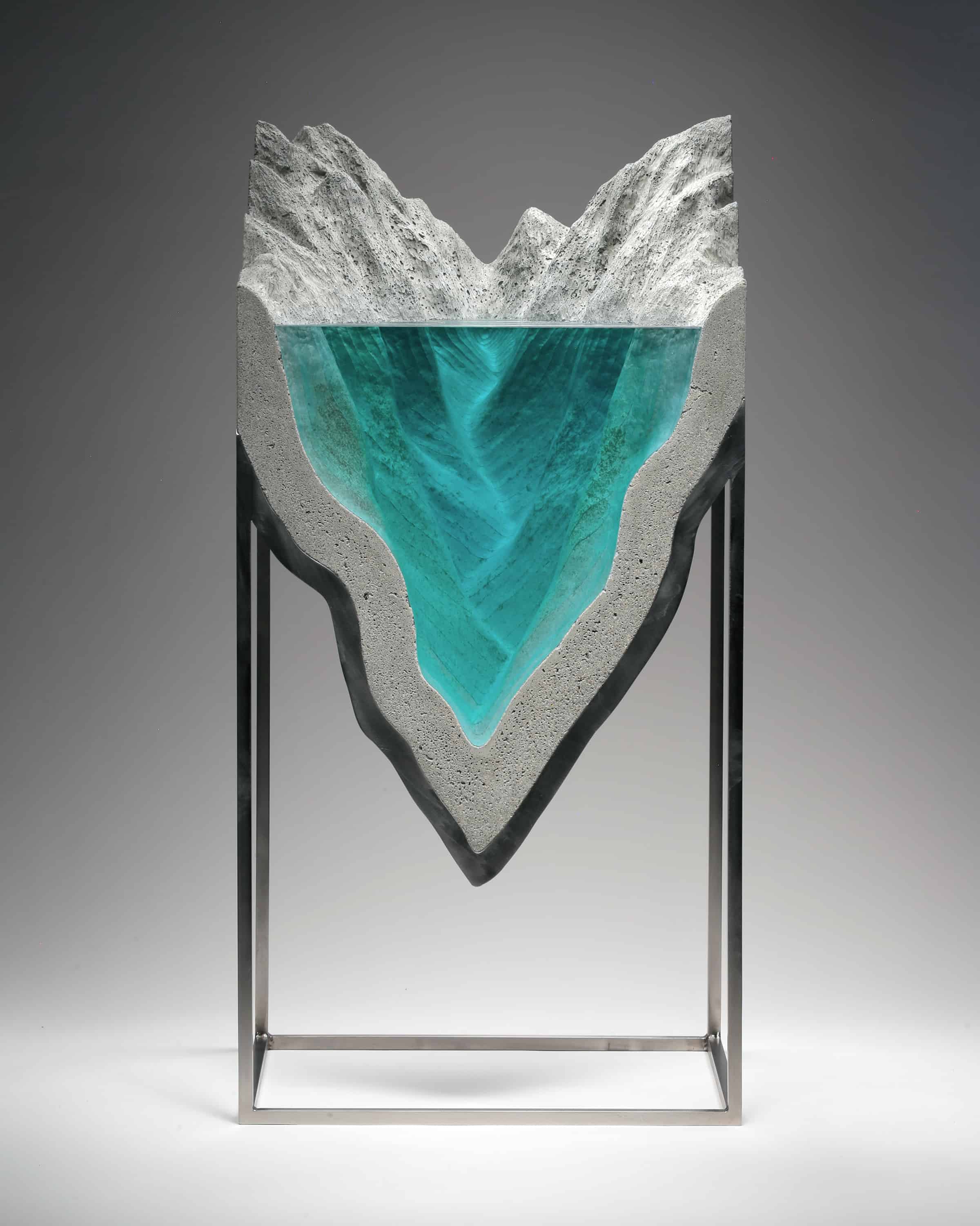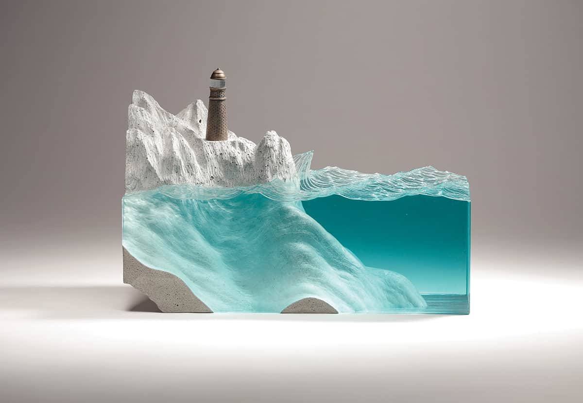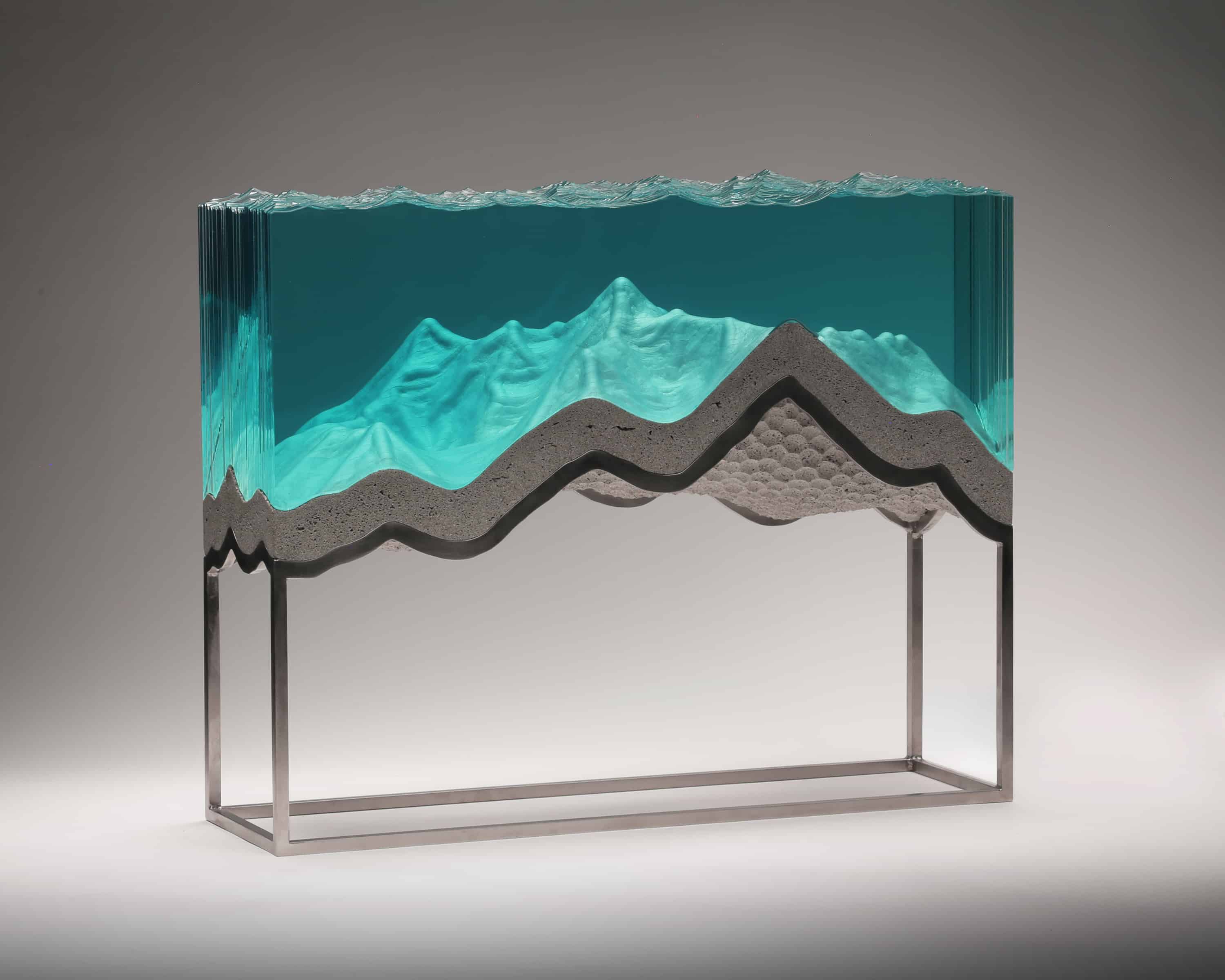 Ben Young utilise des techniques manuelles pour transformer des feuilles de verre en sculpture lumineuses. Des sculptures lumineuses qui donnent un aperçu d’un moment dans le temps ou dans l’espace. L’artiste imagine, coupe à la main et construit soignement ses sculptures à l’aide de couches de verre, souvent pour évoquer l’eau, et des formes organiques en béton pour évoquer la topographie. Il y ajoute alors des détails en métal comme un plongeur, un phare ou encore un voilier.