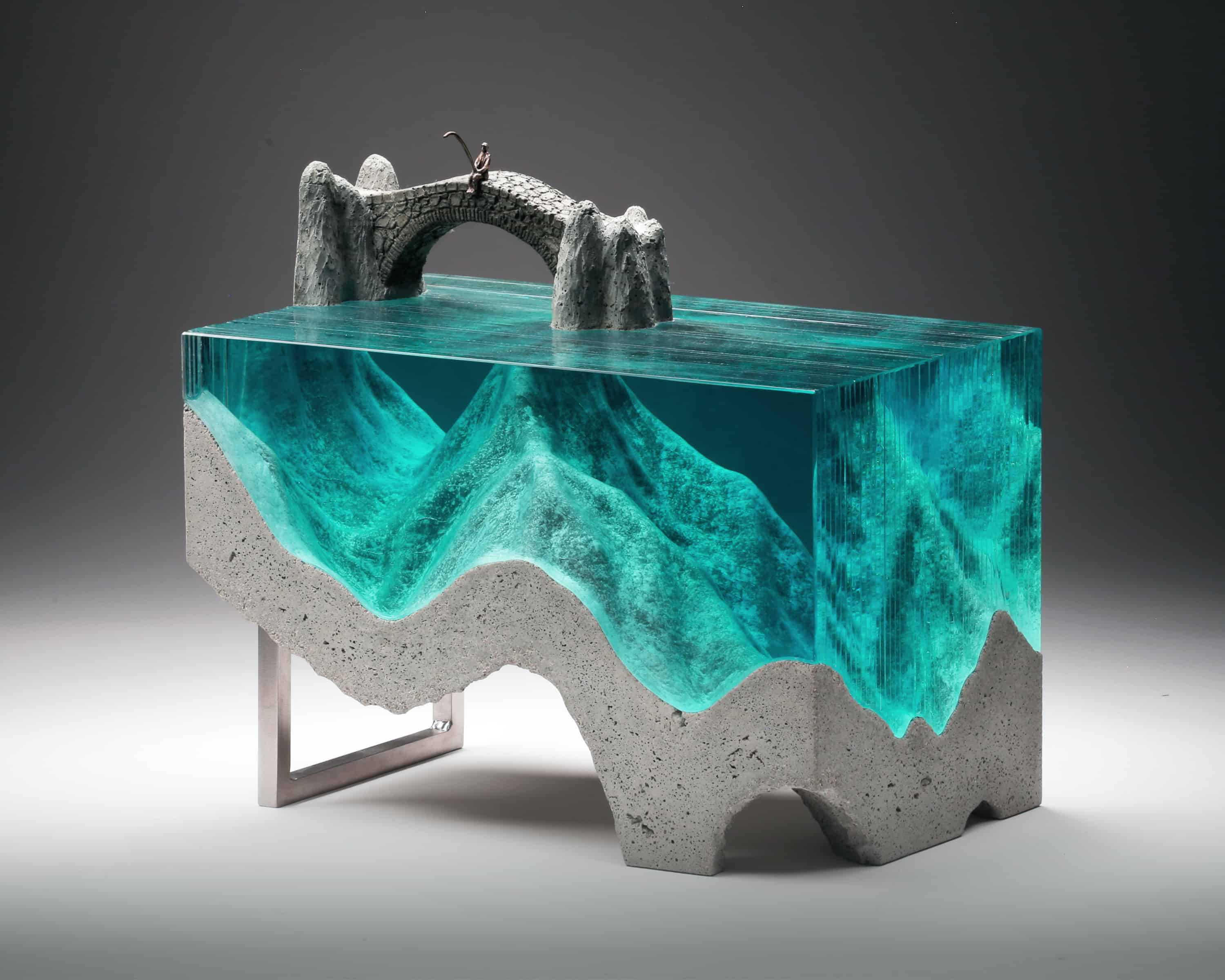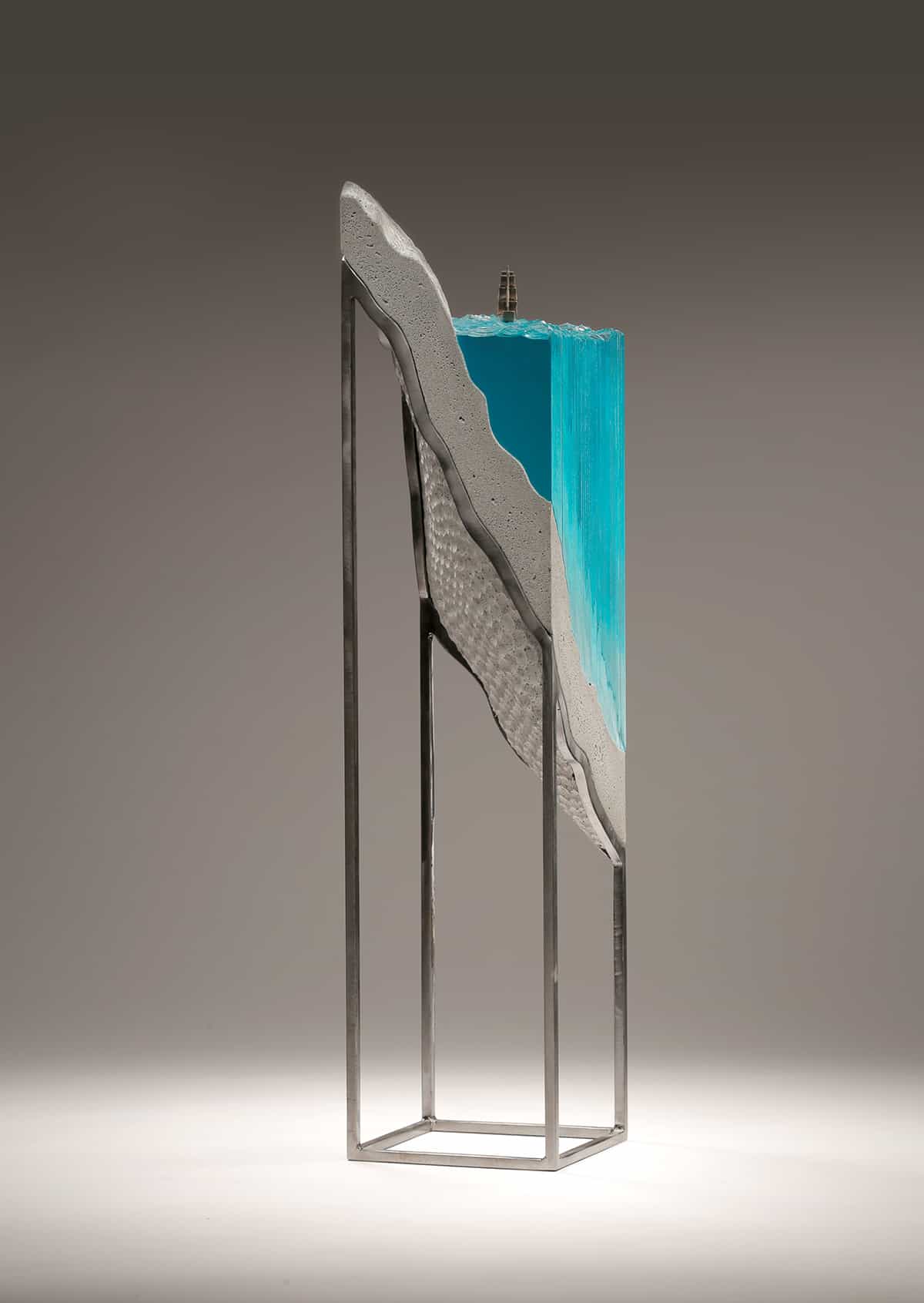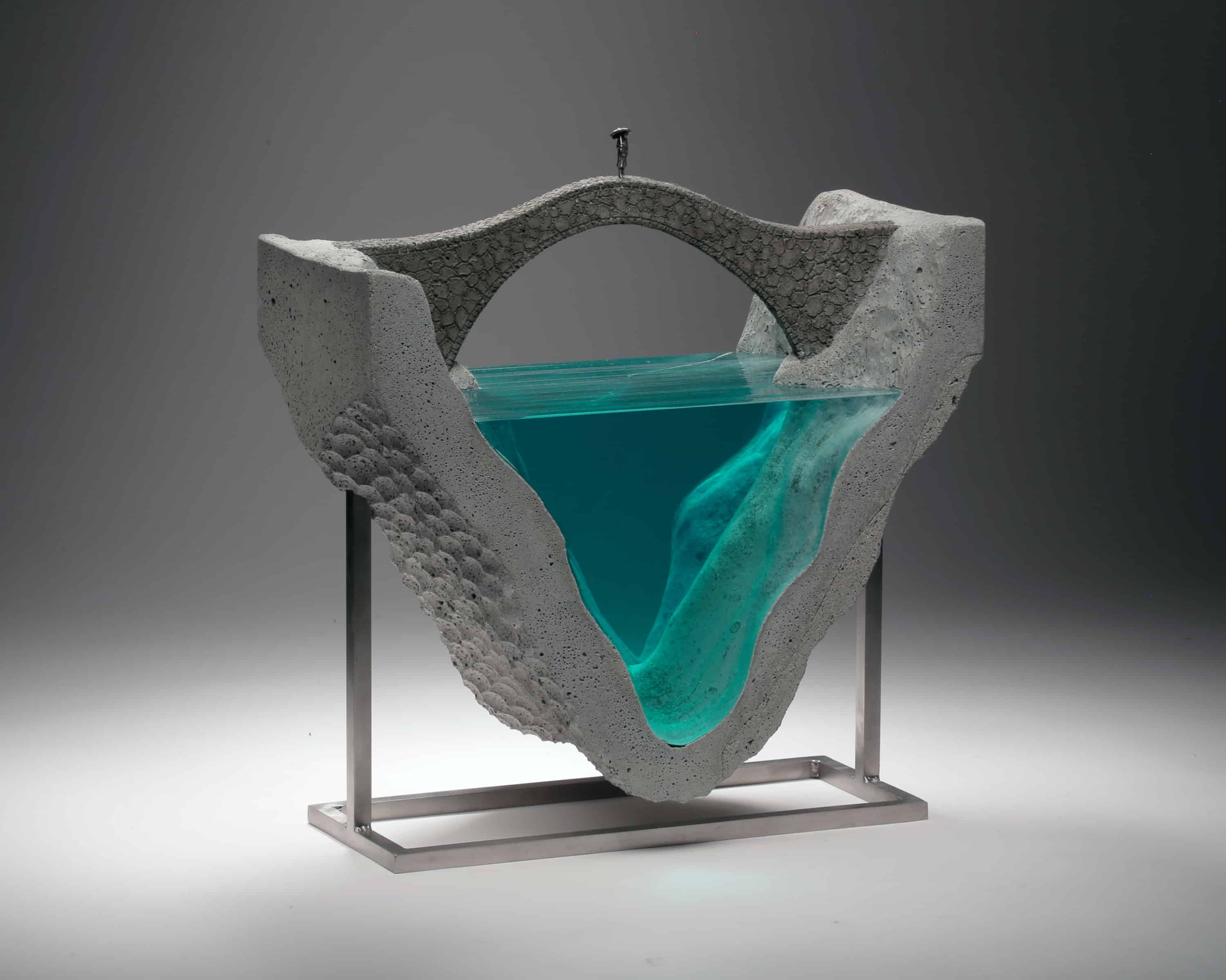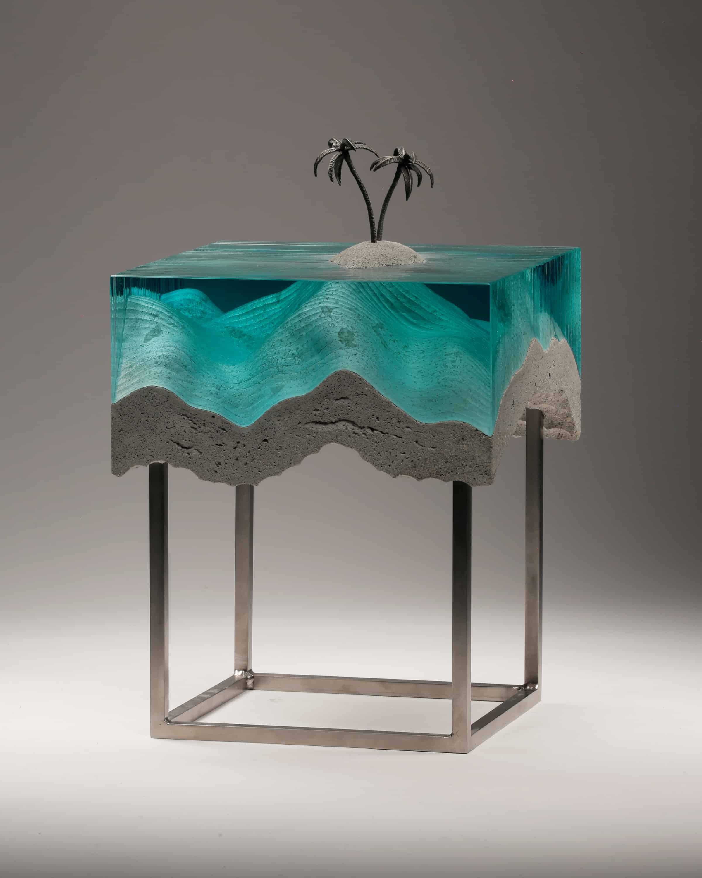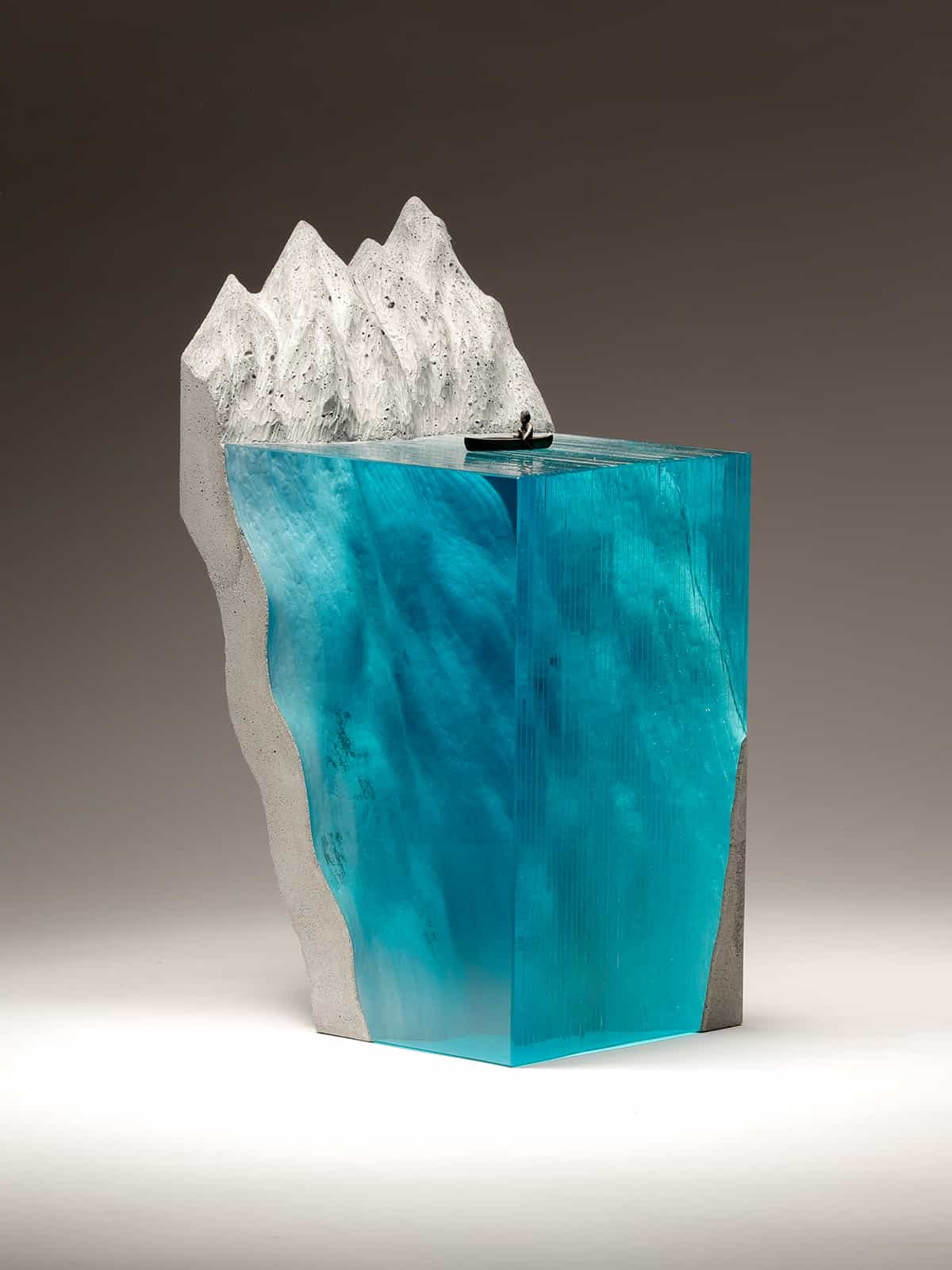 Ben Young utilise des techniques manuelles pour transformer des feuilles de verre en sculpture lumineuses. Des sculptures lumineuses qui donnent un aperçu d’un moment dans le temps ou dans l’espace. L’artiste imagine, coupe à la main et construit soignement ses sculptures à l’aide de couches de verre, souvent pour évoquer l’eau, et des formes organiques en béton pour évoquer la topographie. Il y ajoute alors des détails en métal comme un plongeur, un phare ou encore un voilier.