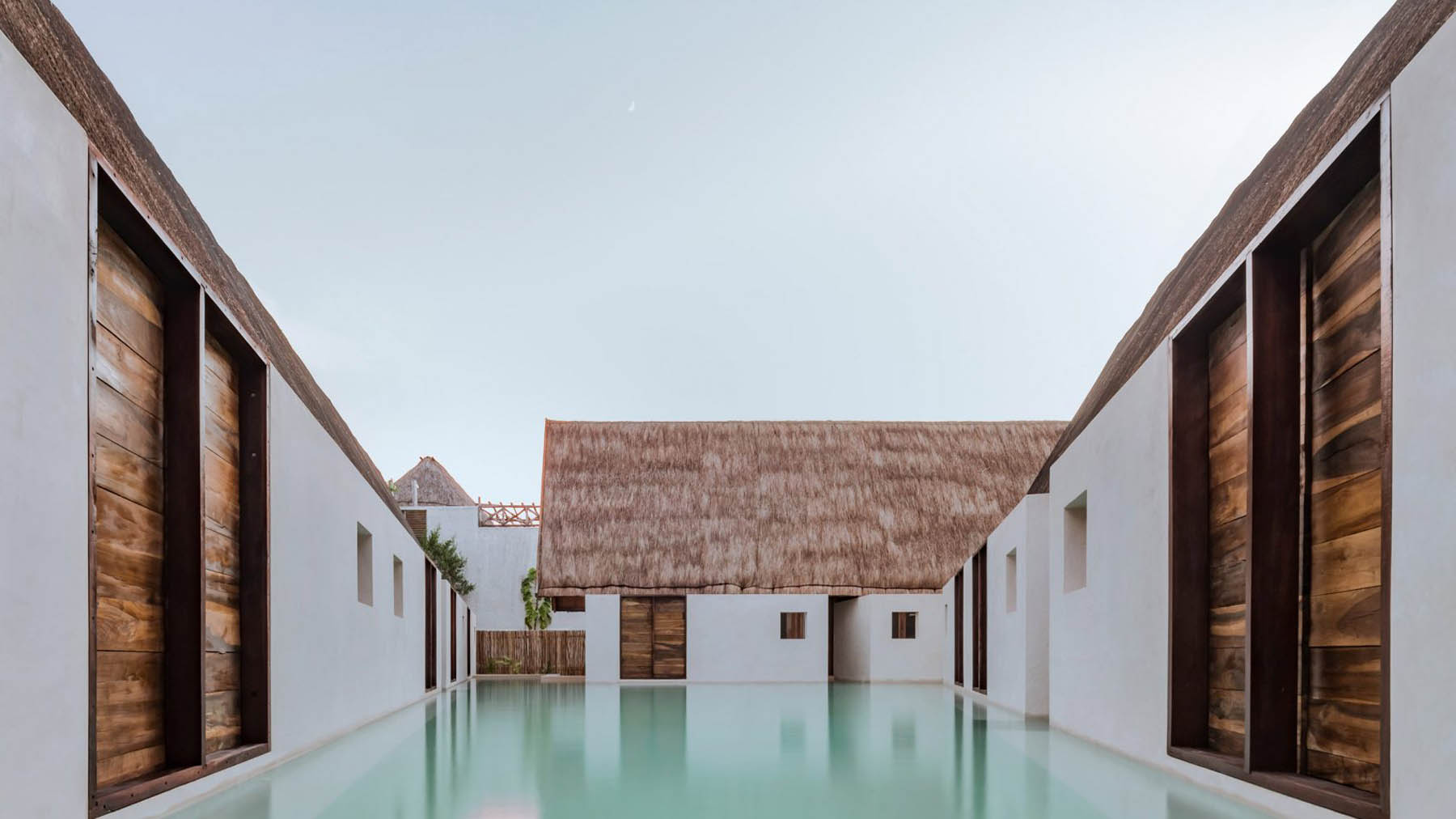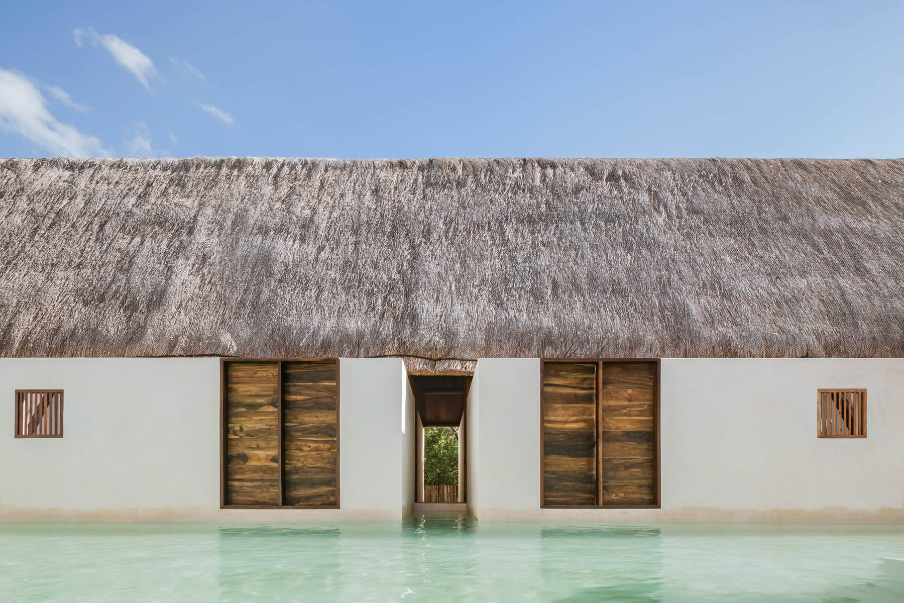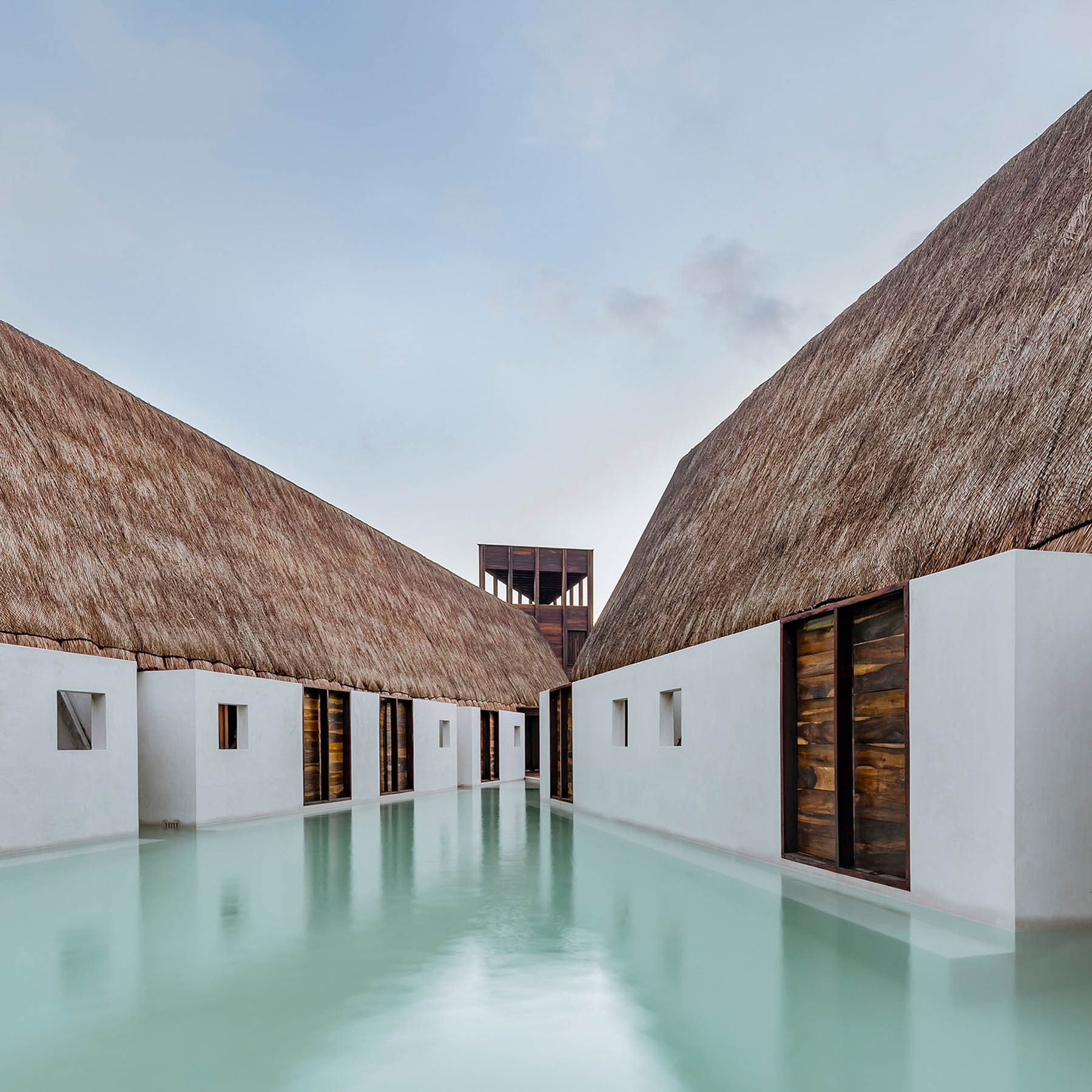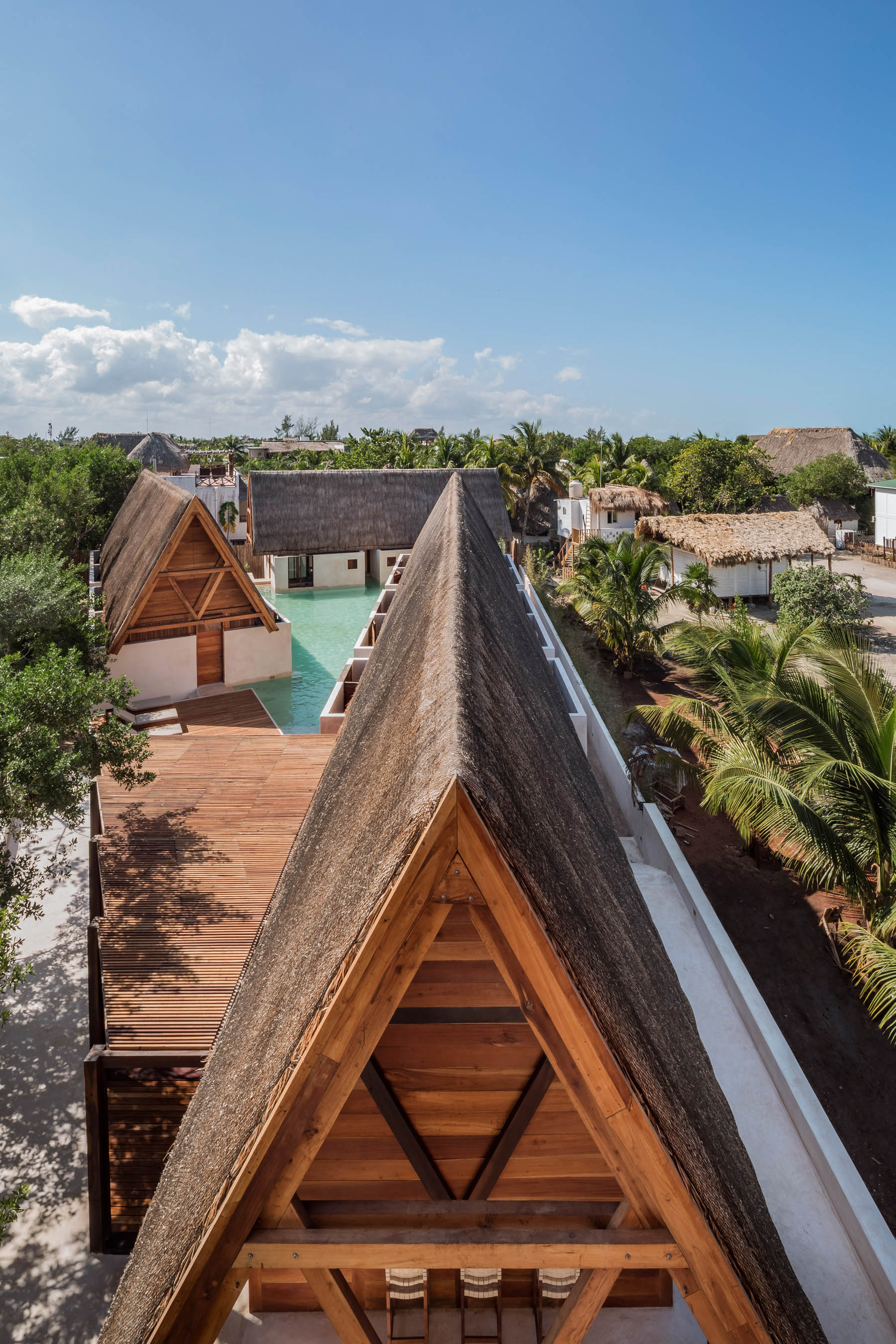 Comme autour de l’île, l’eau est l’attraction principale de cet hôtel. La piscine sert de point central au complexe, prenant la place d’une cour maya traditionnelle. Chqcune des douze chambre dispose de sa piscine privée qui se connecte à la masse d’eau principale au centre de l’hôtel. Les bâtiments ont été construits à partir de cèdres rouges cultivés par la famille. Leurs toits en pente et en chaume, ainsi que la technique du chukum utilisée pour les rendre imperméables, sont des odes aux méthodes de construction mayas.