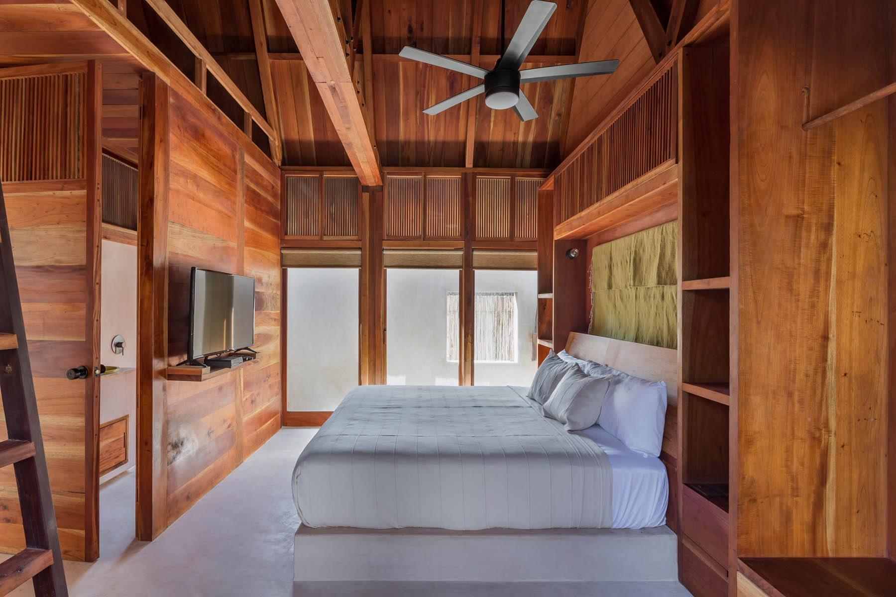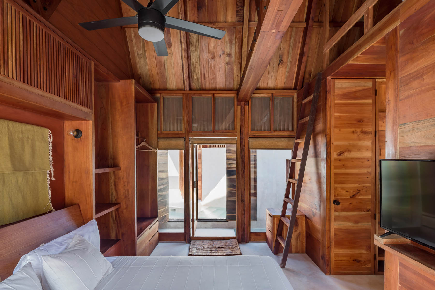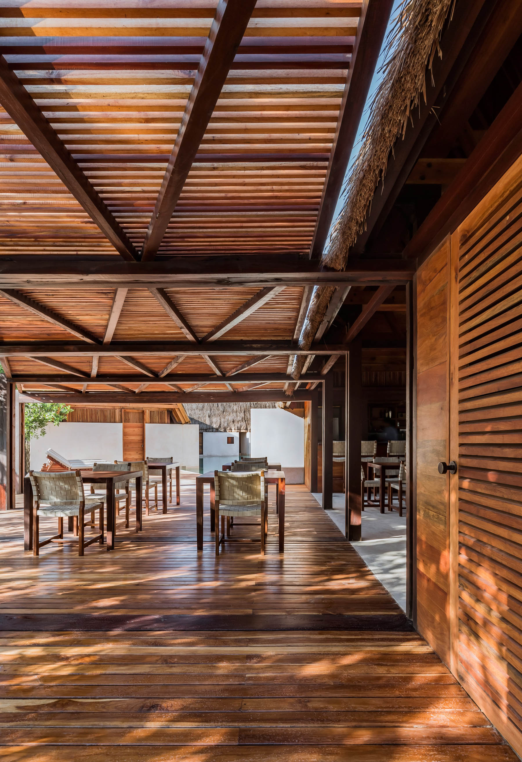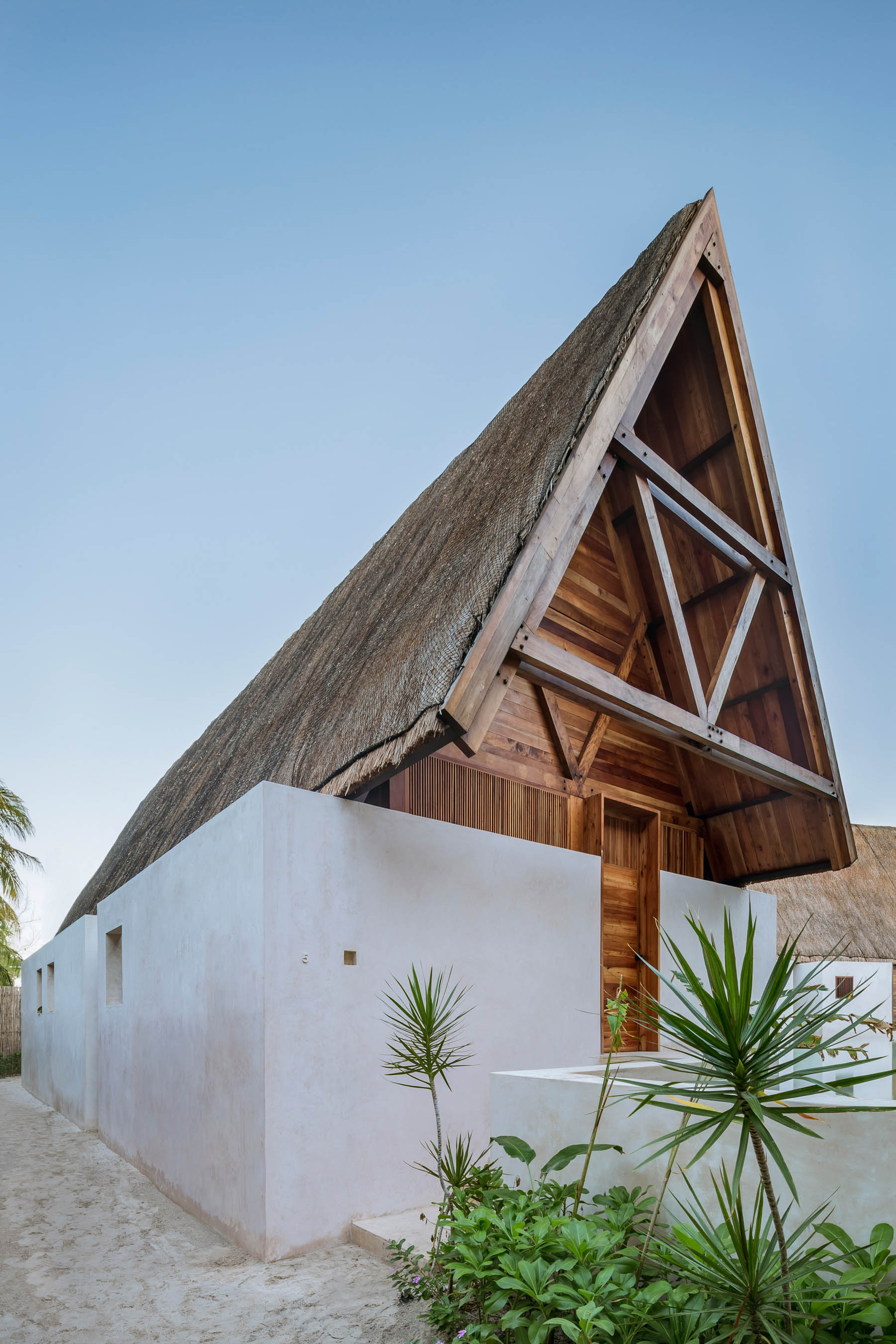 Comme autour de l’île, l’eau est l’attraction principale de cet hôtel. La piscine sert de point central au complexe, prenant la place d’une cour maya traditionnelle. Chqcune des douze chambre dispose de sa piscine privée qui se connecte à la masse d’eau principale au centre de l’hôtel. Les bâtiments ont été construits à partir de cèdres rouges cultivés par la famille. Leurs toits en pente et en chaume, ainsi que la technique du chukum utilisée pour les rendre imperméables, sont des odes aux méthodes de construction mayas.