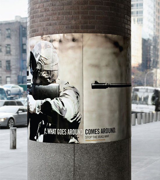 Et non ça n’est pas la suite de Top Gun mais une campagne militant pour la fin de la guerre en Irak. Big Ant International a réussi gros coup en réalisant cette campagne d’ambiant marketing. Cette société basée à New York a par ailleurs gagné le style d’or du design au One Show Design Awards en créant ces quatre affiches pour la Global Coalition for Peace