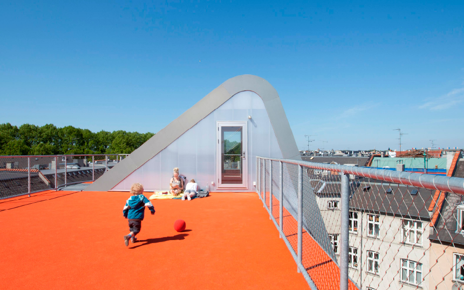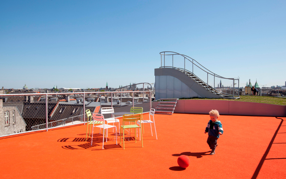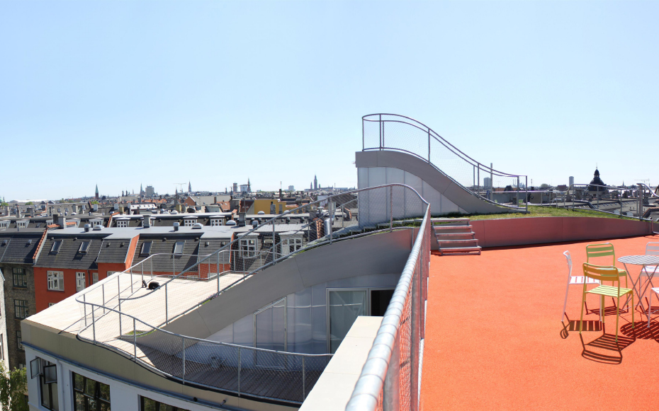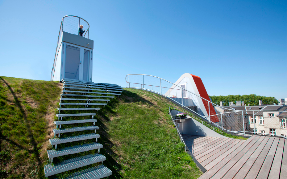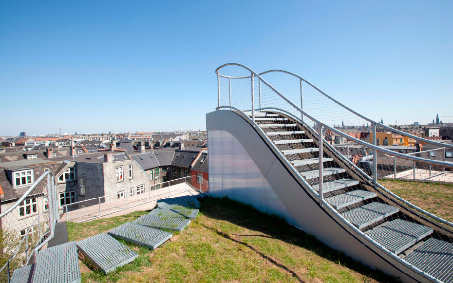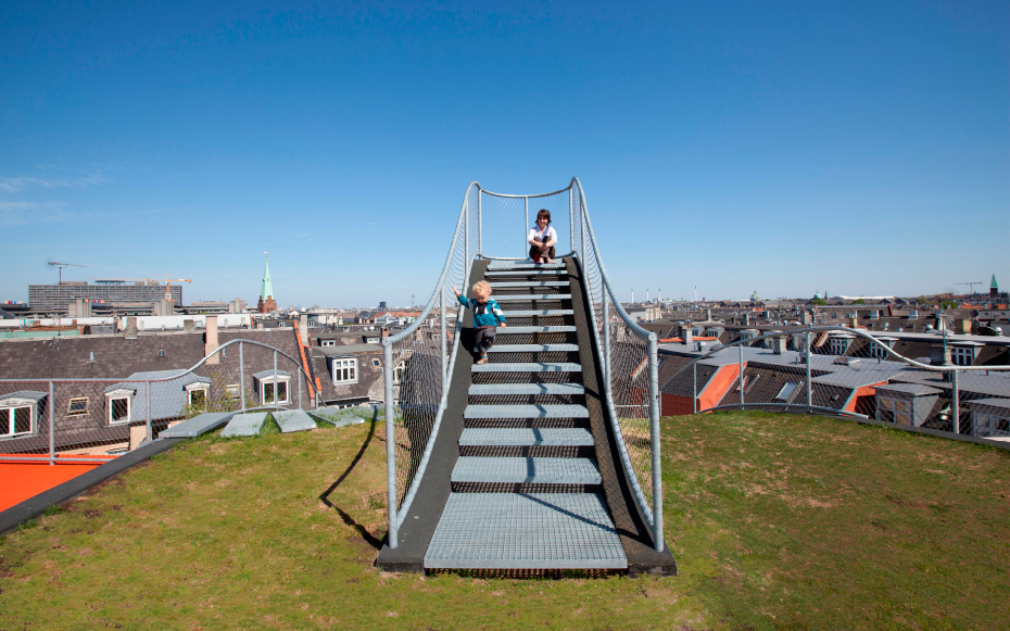 Brillante idée élaborée par le cabinet d’architectes Julien de Smedt (JDS) Architects. Situé dans le district Elmegade à Copenhague, voici un jardin situé au sommet d’un immeuble. Une idée très agréable pour les propriétaires de l’immeuble qui peuvent profiter pleinement de ce jardin privé. Plusieurs aspects ludiques, ce jardin comporte une aire de jeux et son pont suspendu, une petite butte et sa verdure naturelle et surtout, une vue imprennable sur la ville de Copenhague.