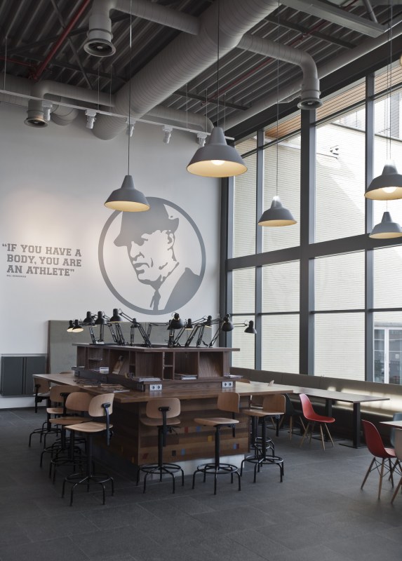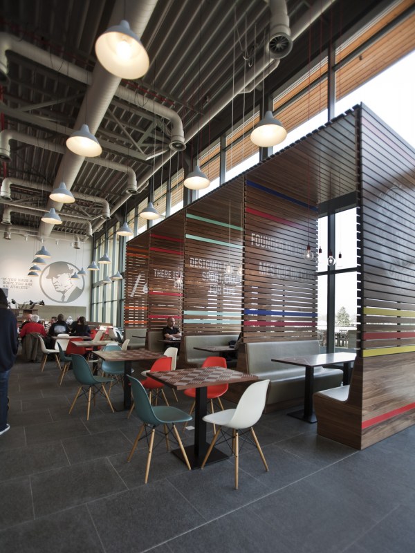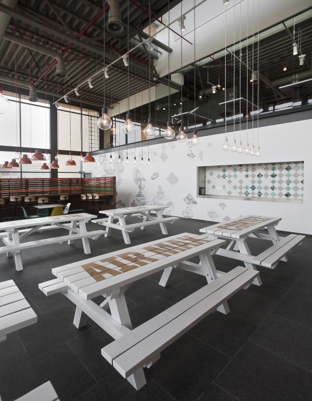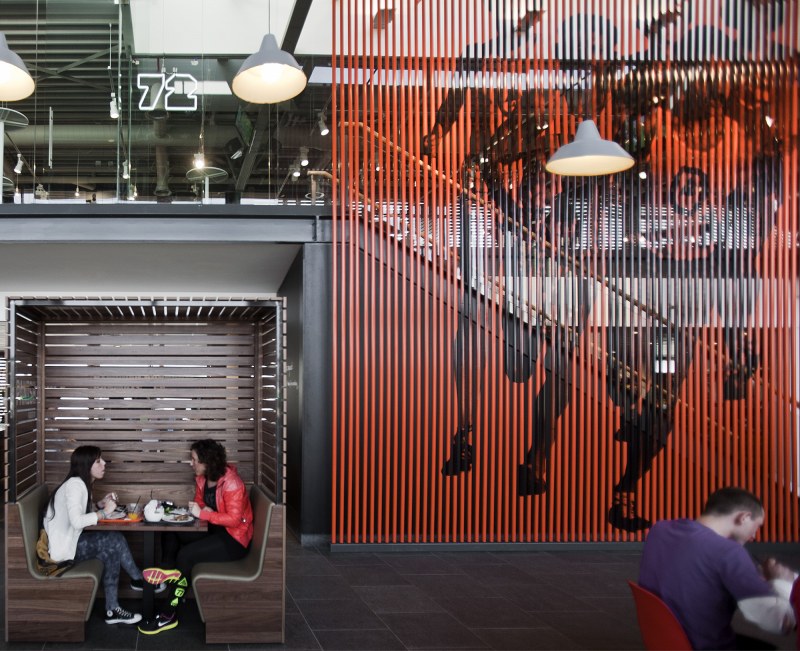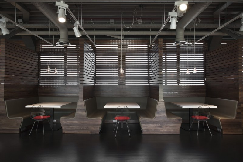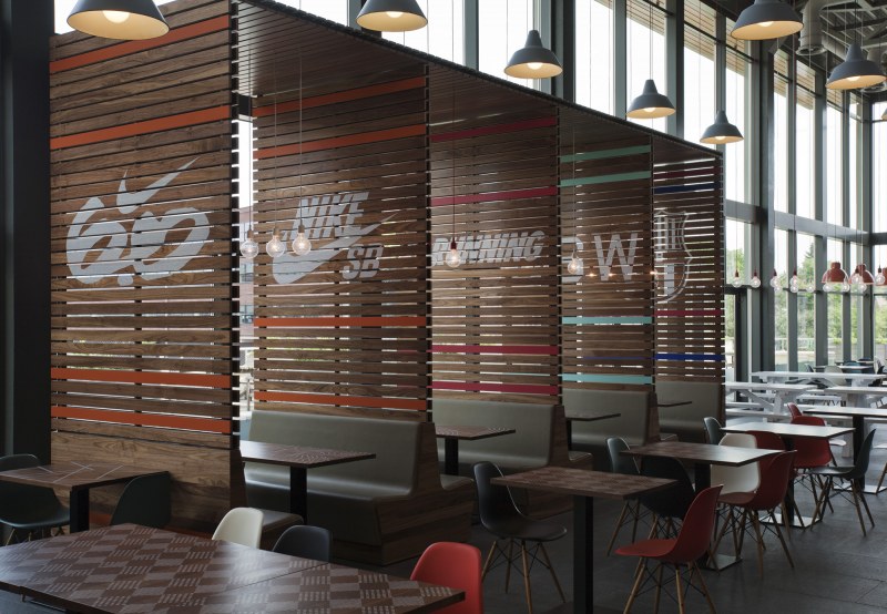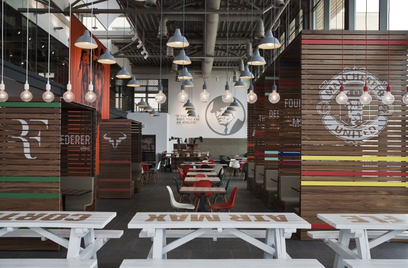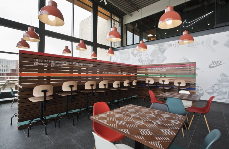Aménagements de la cantine de Nike à Hilversum revus par les studios UXUS. Une composition assez variée allant des larges tables pour faciliter l’accès aux groupes, des box, plus intimes. Une cantine développée en collaboration avec l’équipe de conception de Nike afin d’obtenir le côté sportif désiré.