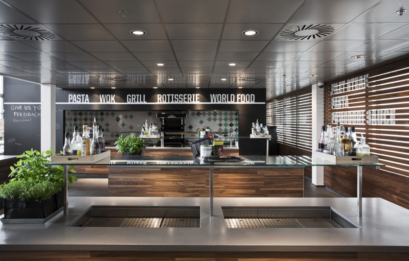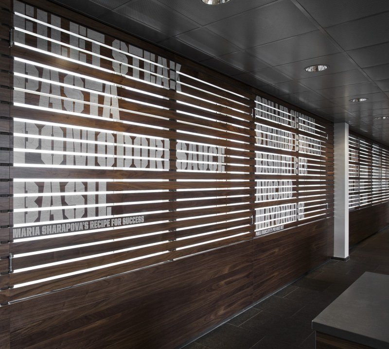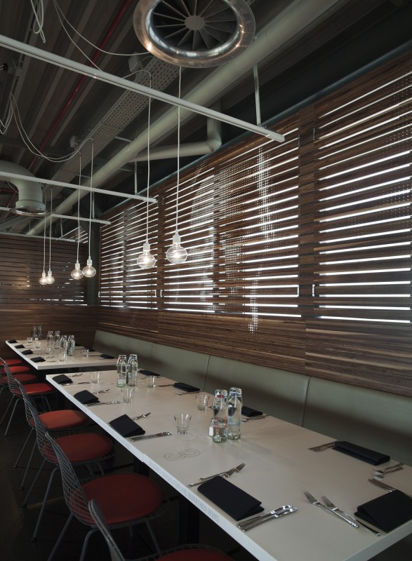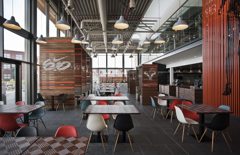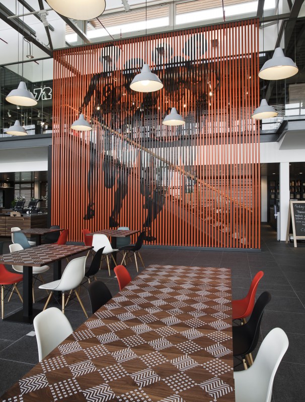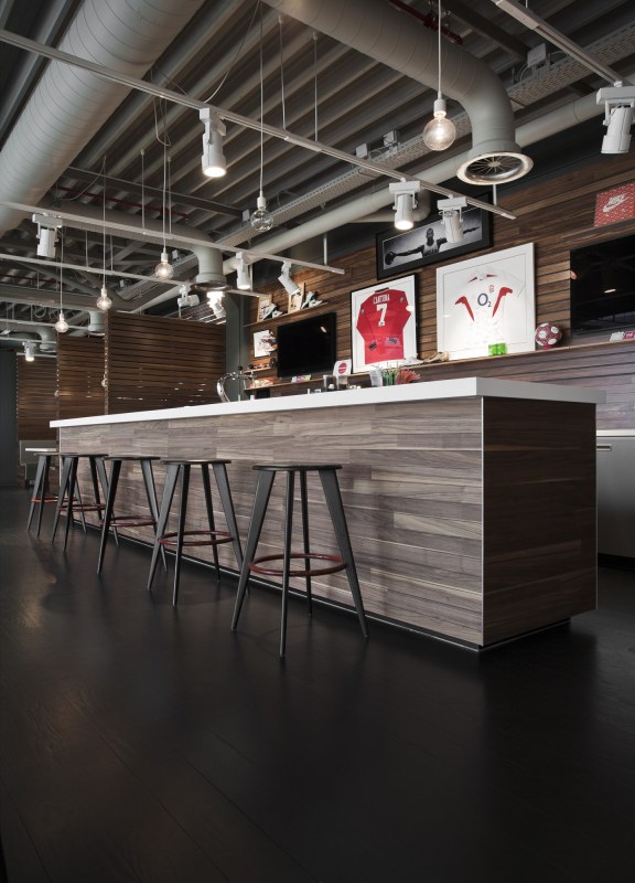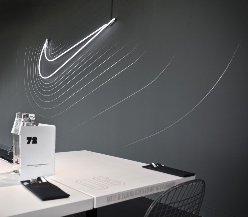 Aménagements de la cantine de Nike à Hilversum revus par les studios UXUS. Une composition assez variée allant des larges tables pour faciliter l’accès aux groupes, des box, plus intimes. Une cantine développée en collaboration avec l’équipe de conception de Nike afin d’obtenir le côté sportif désiré.