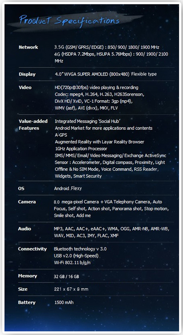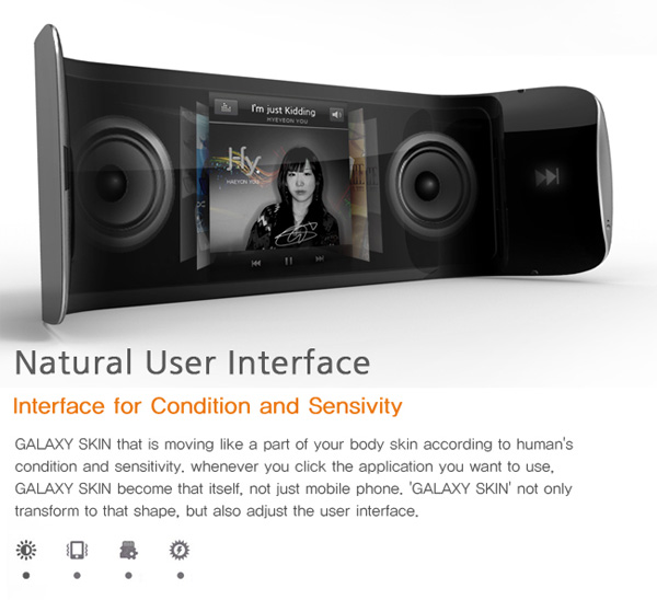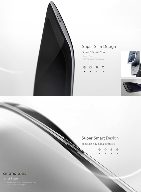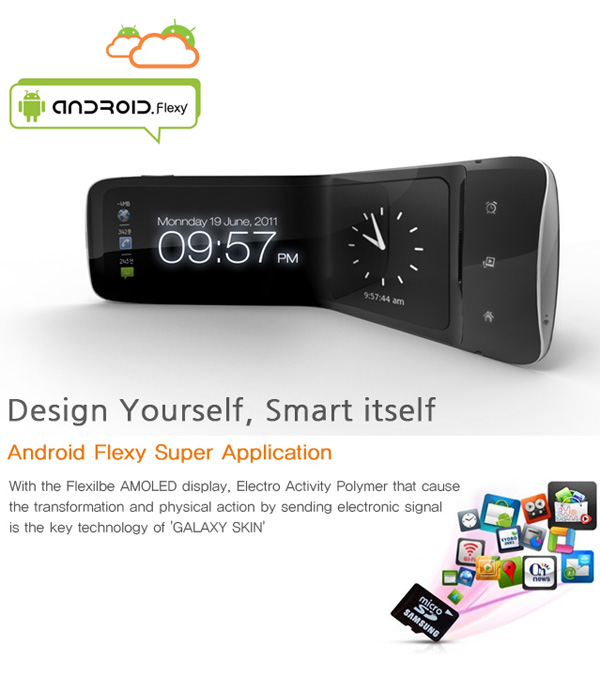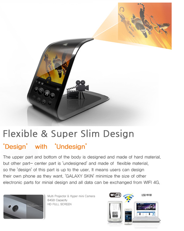 Certainement plus fonctionnel et plus facile à mettre en place que le Nextep de Sony, le Samsung Galaxy Flexi Skin semble être un bon compromis entre les smartphones tels que nous les connaissons aujourd’hui et ceux de demain. Un design élaboré par Heyon You pour un smartphone fonctionnel muni d’un appareil photo numérique de 8megapixels, d’un projecteur et bien sûr d’un écran AMOLED flexible de 4″ (seulement, oserais-je dire) le tout propulsé par Android.