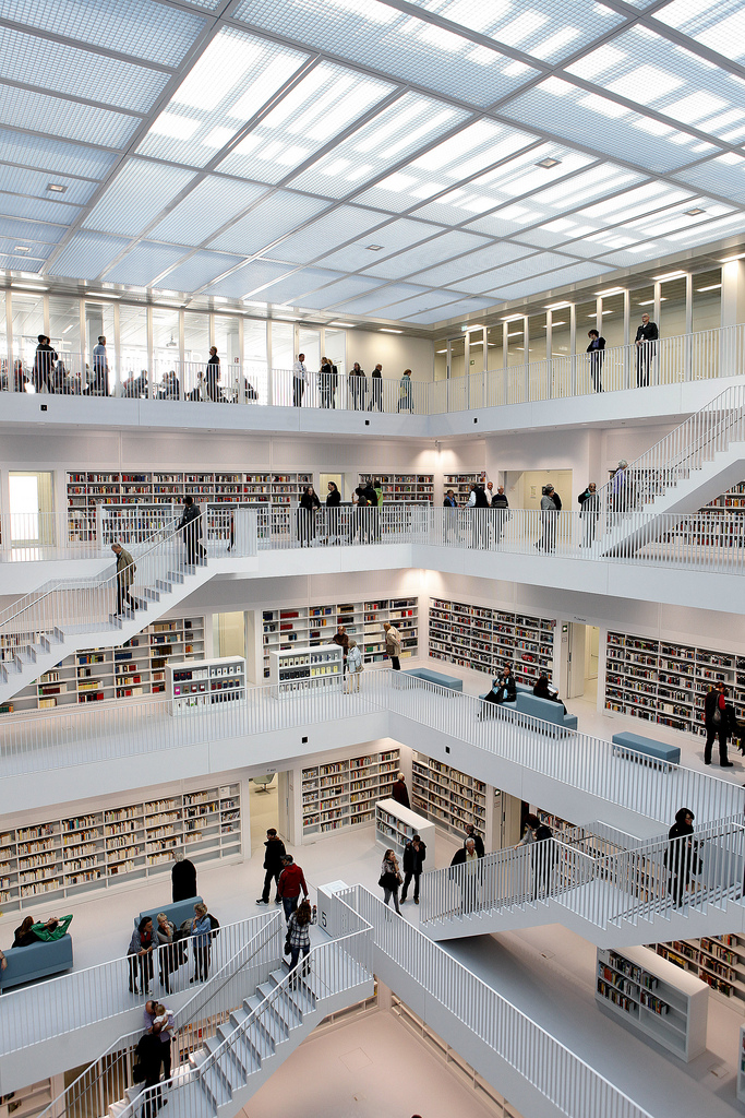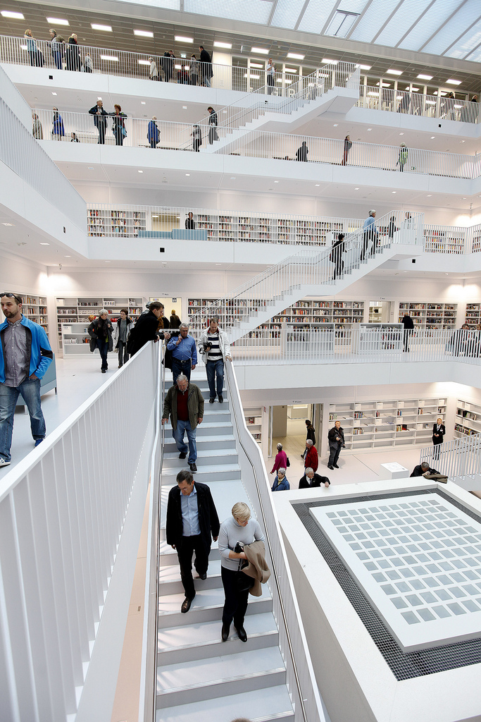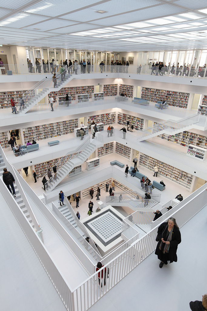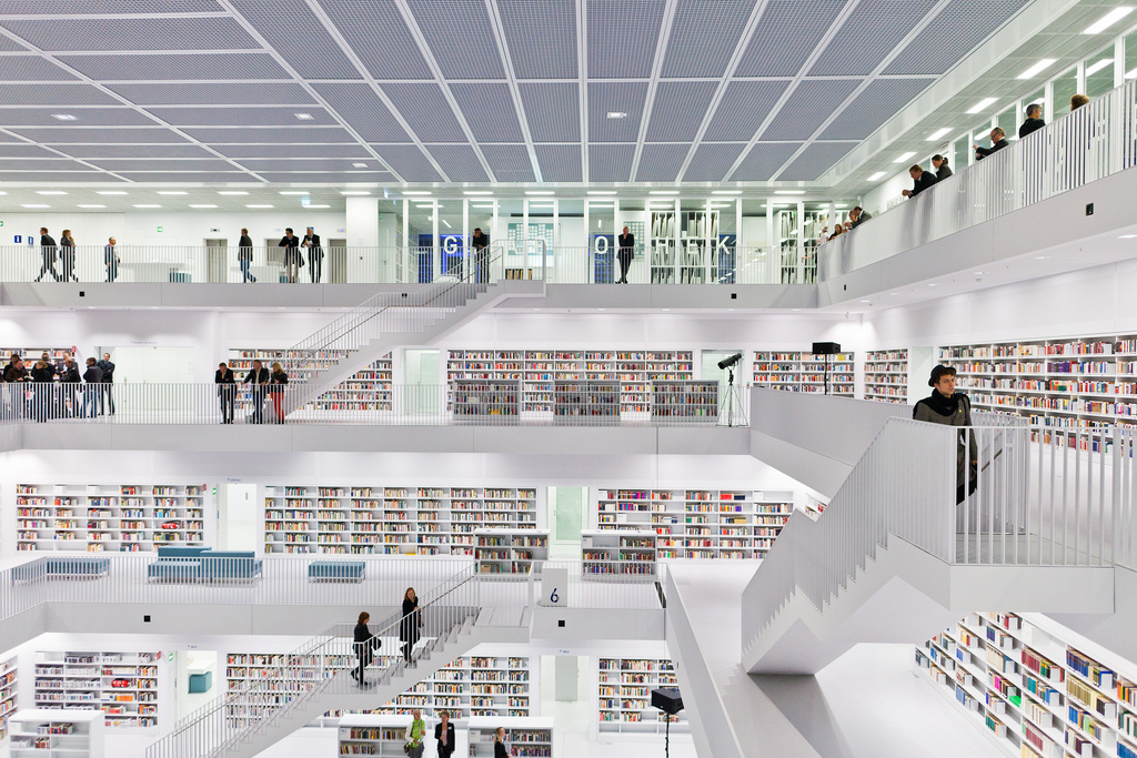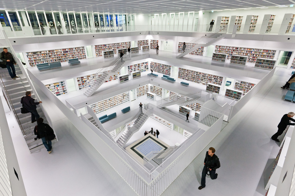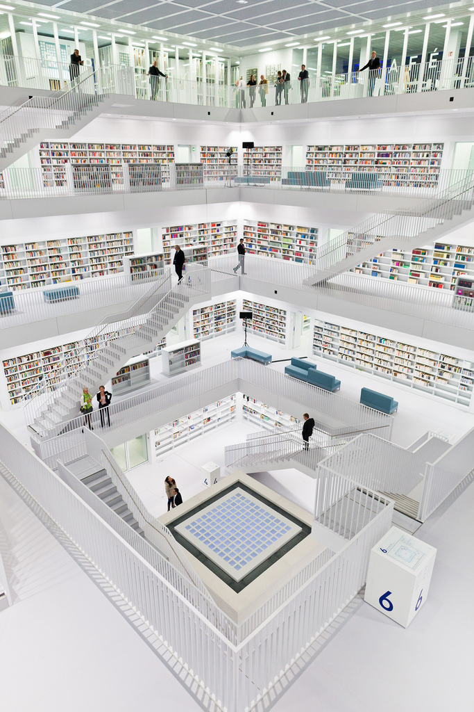 La nouvelle bibliothèque municipale de la ville de Stuttgart en Allemagne a ouvert officiellement ses portes ce 24 octobre 2011. L’occasion de découvrir une merveille architecturale moderne réalisée par Yi Architects. Un style très épuré, tout de blanc vêtu où règne pourtant une harmonie de couleurs grâce aux livres et aux visiteurs. Un intérieur lumineux sans éclairage direct grâce notamment au blanc, mais également à cet atrium centrale tout en hauteur sur les cinq étages que composent cette bibliothèque.