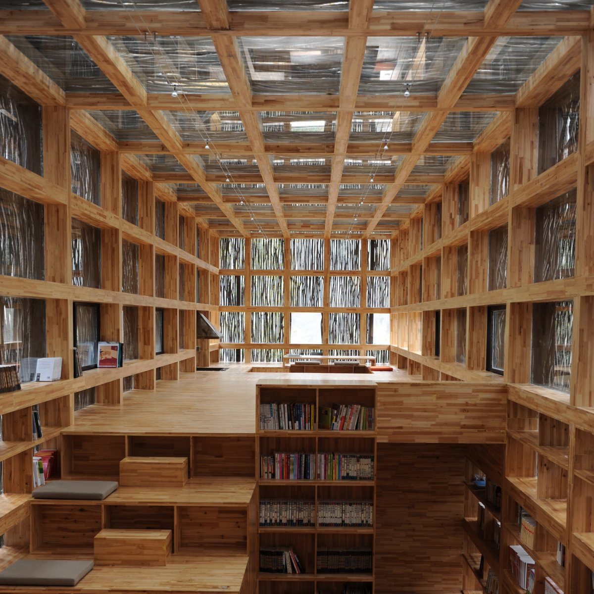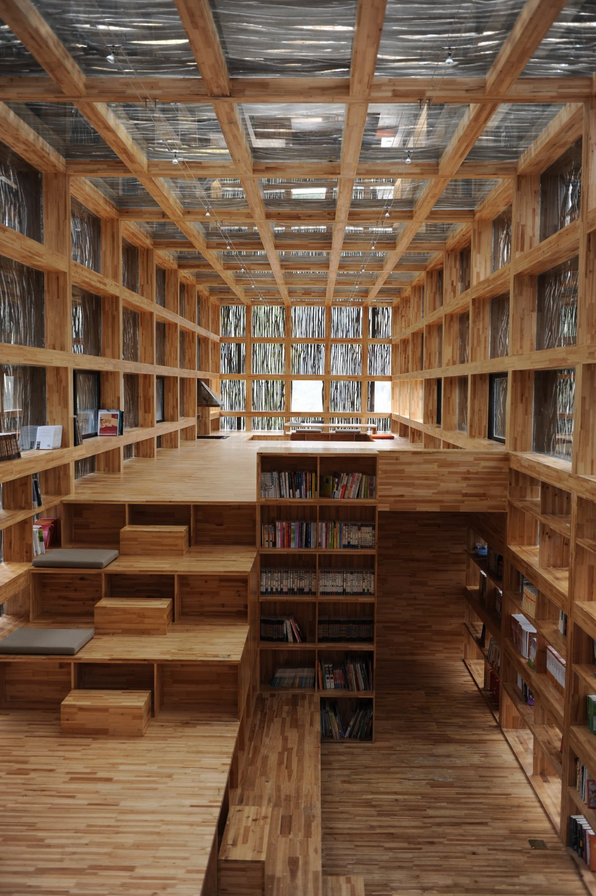 Superbe travail des ateliers Li Xiaodong en réalisant l’architecture de cette bibliothèque municipale du district de Huairou en Chine. Une architecture qui semble aux premiers abords calme et reposante tout en se voulant écologique. Un intérieur éclairé naturellement accueillant et spacieux.